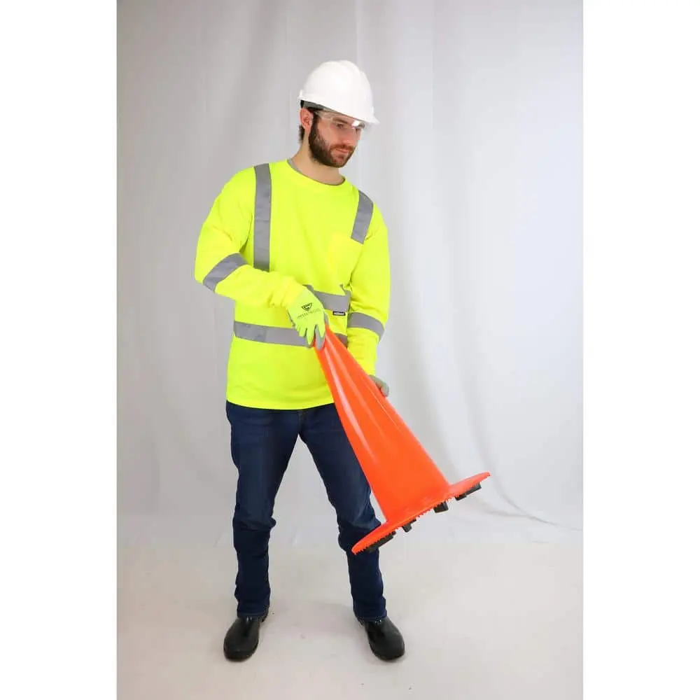 Stay visible and protected in any work setting with this ANSI Class 3 Type high-visibility long-sleeve shirt. Made from breathable 100% polyester knit fabric, it delivers lasting comfort throughout the day. The bright hi-visibility yellow color and retro-reflective tape across the body and shoulders enhance visibility during both daytime and nighttime conditions. A wider neck opening adds to comfort and breathability, while the exterior chest pocket offers convenient storage. Ideal for construction sites, roadways, and other work zones requiring high-visibility ANSI protection.