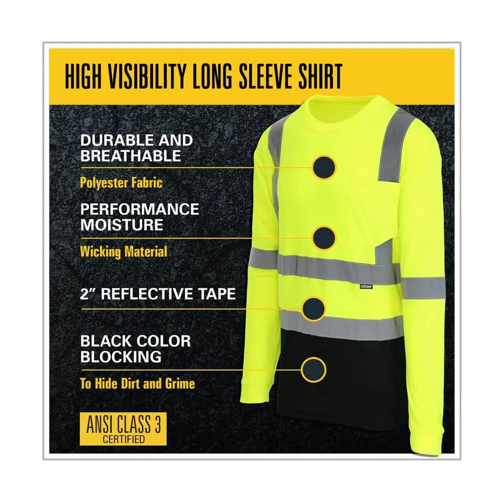This ANSI Class 3 Type high-visibility long-sleeve shirt provides complete visibility, making it perfect for roadway, construction, and other work environments that require ANSI protection. Featuring a black bottom that effectively conceals dirt and grime, the shirt is made from performance-wicking fabric to keep you dry and comfortable. An exterior chest pocket offers easy access to storage, while the 2-inch reflective tape enhances your visibility in both daylight and low-light conditions. Crafted from 100% knitted polyester, this shirt is breathable and ensures comfort, with retro-reflective tape that shines brightly in various lighting conditions.