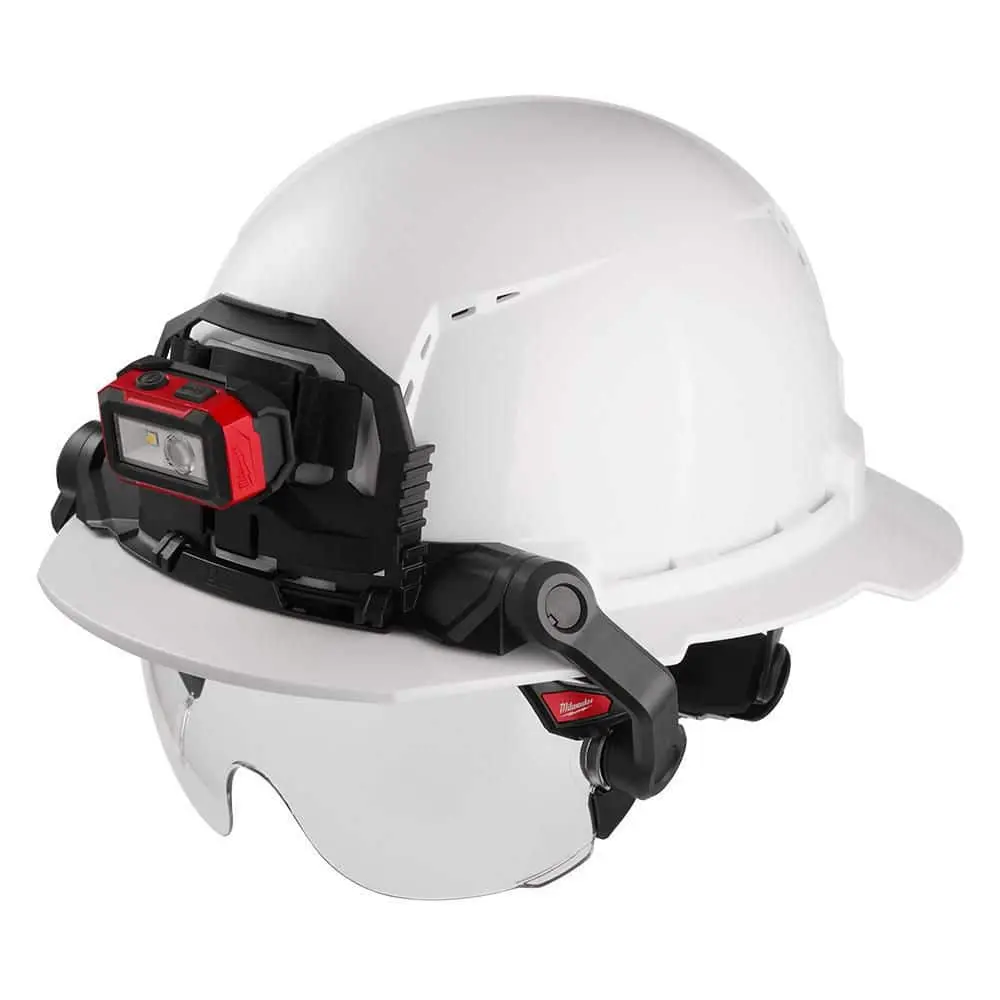 The MILWAUKEE BOLT Eye Visor is engineered for comfort and seamless headlamp compatibility. Rated as Z87.1+ safety spectacles, this eye visor can replace standard safety glasses. Its adjustable pivoting design ensures a secure and comfortable fit for various face shapes. The visor includes a BOLT Low-Profile Headlamp Mount, making it compatible with most headlamps. Each visor features a fog-free interior coating and a durable, anti-scratch exterior coating to extend its lifespan. As part of the BOLT System, it allows for simultaneous accessory attachment, securing easily into the BOLT front mount of MILWAUKEE safety helmets and hard hats.