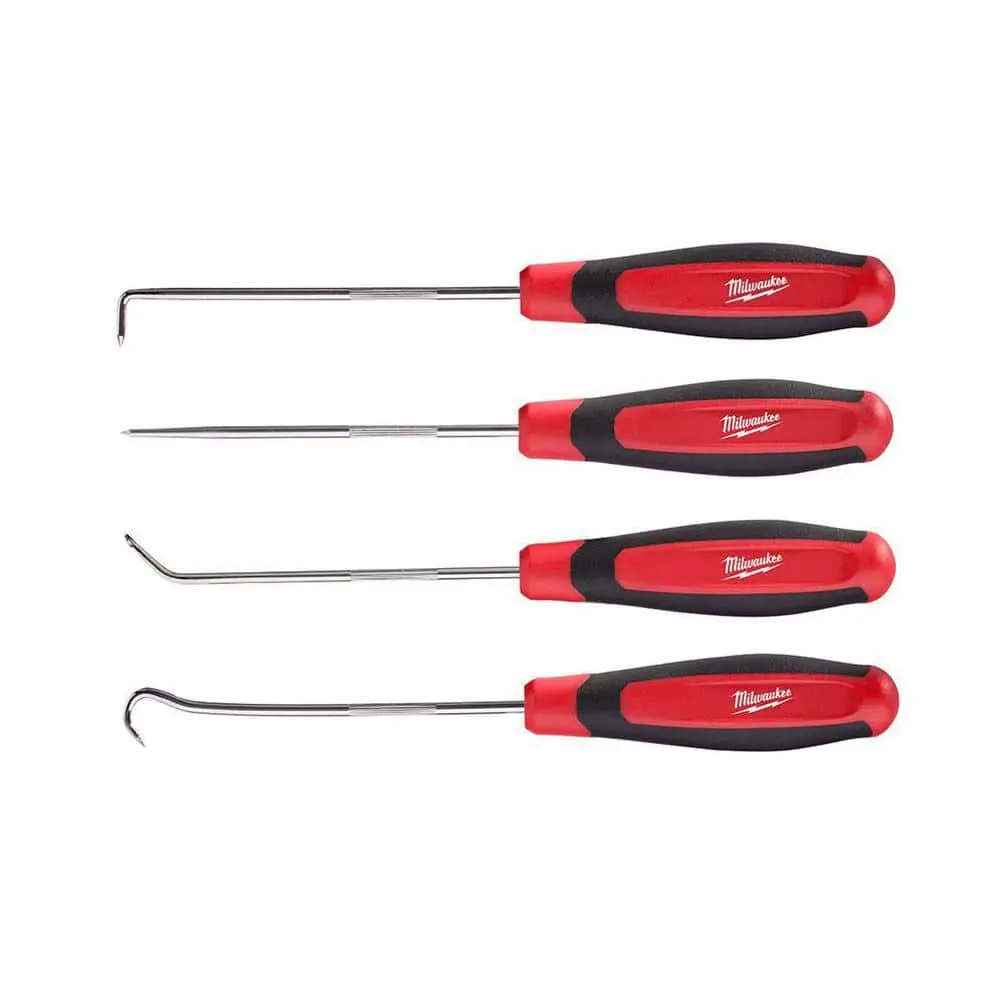 The Milwaukee Hook and Pick Set (4-Piece) is designed for durability and precision in various tasks. This set includes 4 pieces with different hook and pick designs, perfect for removing O-rings, seals, and gaskets. The durable steel construction ensures long-lasting strength, while the ergonomic handle provides comfort and a secure grip during use. With color-coded handles, the set offers easy identification, making it ideal for automotive, electrical, and mechanical applications