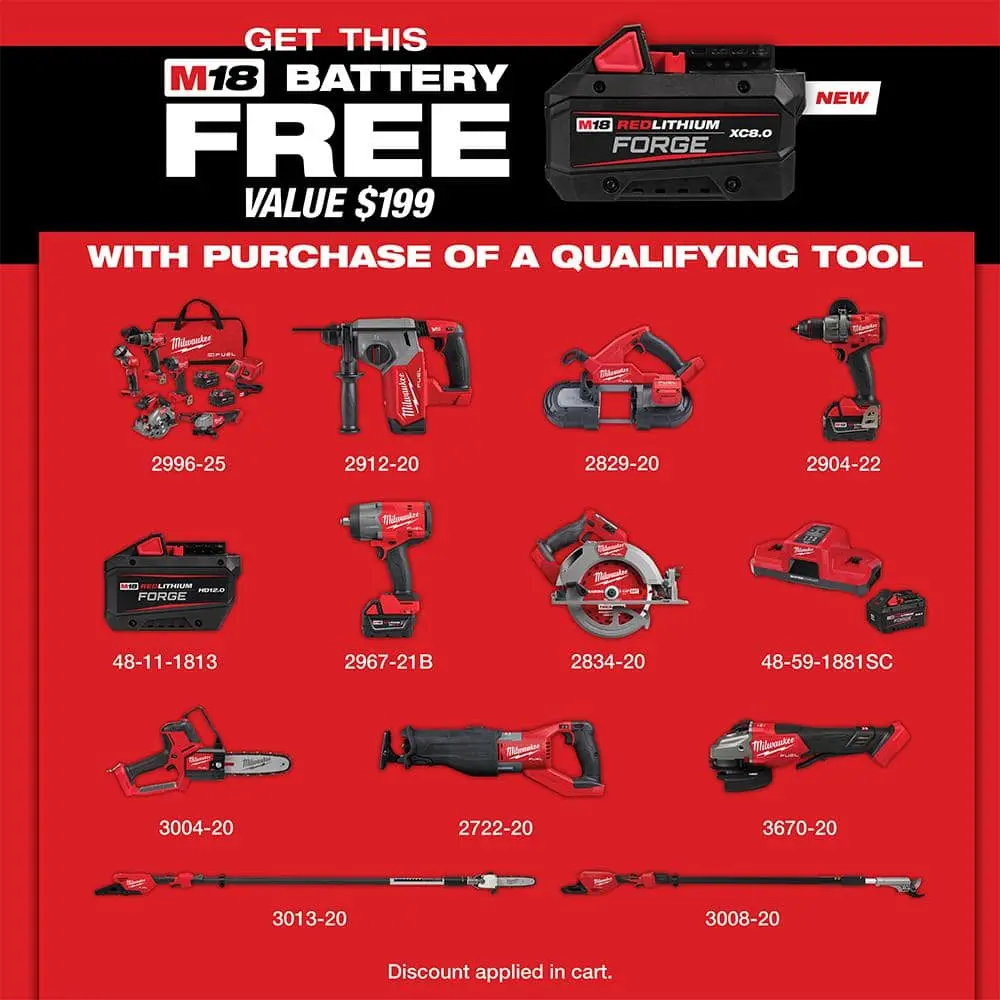 The MILWAUKEE M18 REDLITHIUM FORGE HD12.0 Battery Pack offers 50% more power than the HIGH OUTPUT 12.0, providing exceptional performance and high-speed cooling for less downtime in high-demand applications. It also features a 35-minute supercharge to 80% and the longest lifespan compared to REDLITHIUM batteries. This battery delivers 12 amp hours of runtime with 50% more power than the HIGH OUTPUT 12.0, ensuring optimal power and runtime for demanding tasks. Equipped with COOL-CYCLE capability, the M18 REDLITHIUM FORGE HD12.0 includes an Active Cooling System that provides high-speed cooling to reduce downtime. The patented ingress coating increases protection, maximizing active cooling through an upgraded venting design. When used with COOL-CYCLE capable chargers, the high-speed cooling ensures efficiency. With the M18 Dual Bay Simultaneous Super Charger, the battery reaches 80% charge in just 35 minutes, allowing you to get back to work quickly. Designed for durability, the housing provides enhanced protection against oils, greases, and solvents. REDLINK Intelligence ensures optimized performance and overload protection, preserving the life of both the battery and tools. The REDLITHIUM FORGE HD12.0 is compatible with over 250 M18 tools.