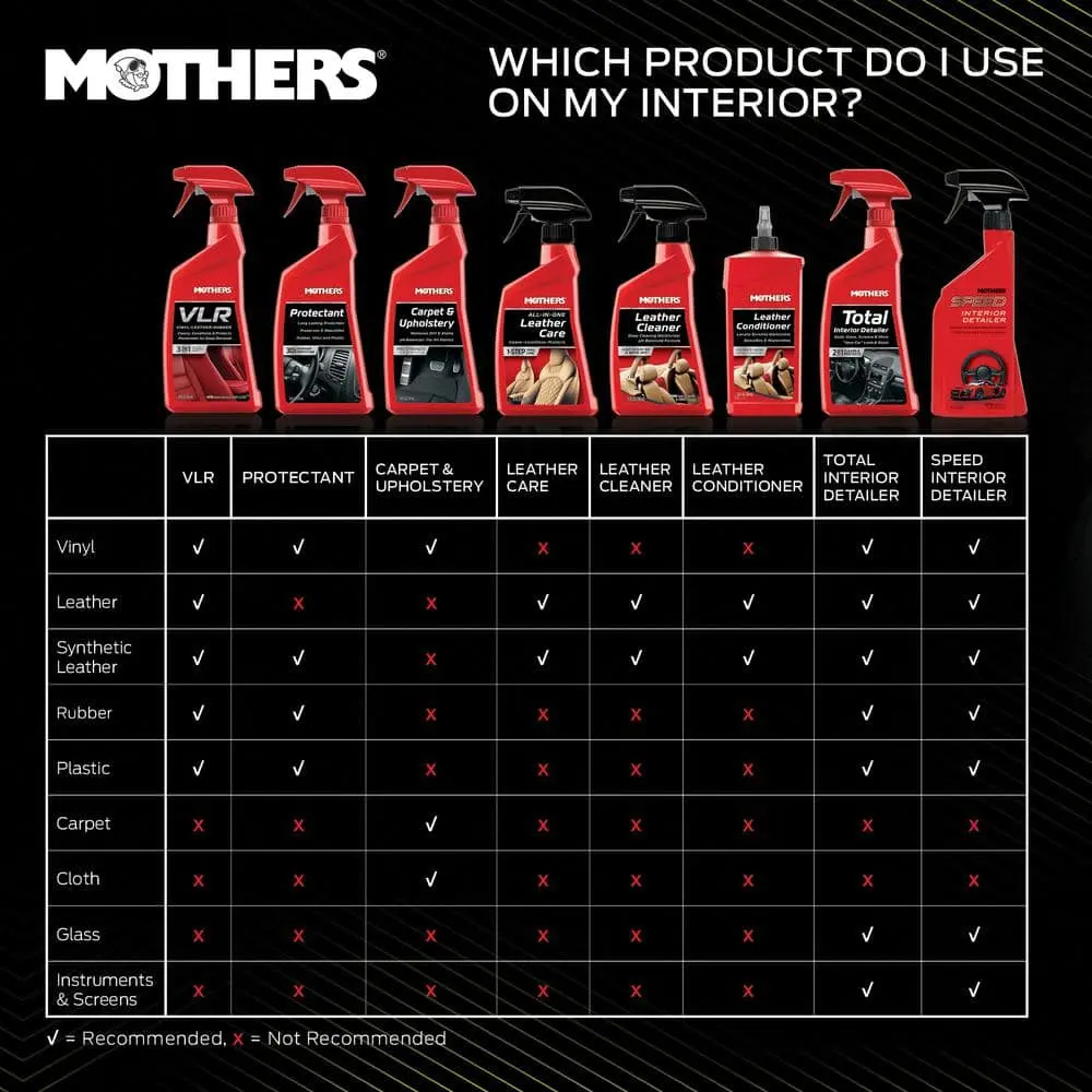 Mothers Speed Interior Detailer makes it effortless to keep your car looking and smelling like new. With just a spray and wipe, this ammonia-free formula uses micro-emulsifying agents and biodegradable surfactants to swiftly break down dirt, oily films, and fingerprints. It leaves your interior surfaces clean and protected, without any greasy residue or streaks. Designed for easy use on a variety of surfaces inside your car, Speed Interior Detailer is ideal for everyday cleaning.