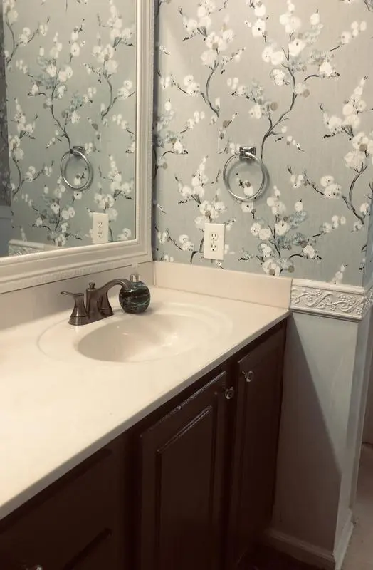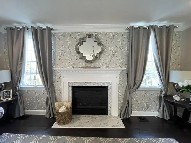 Drawing inspiration from Japanese blossoms, this floral design exudes timeless elegance. Delicate blue, yellow, and white flowers flourish against a grey linen print background. The Mirei peel and stick wallpaper is available in a roll that measures 20.5 inches wide by 18 feet long.