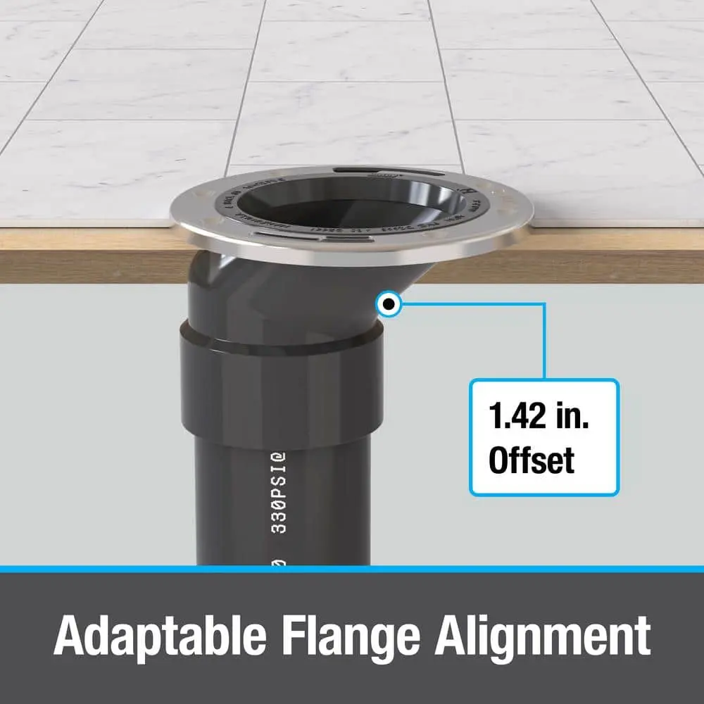 The Oatey Level Fit Offset Closet Flange is designed for durability with a stainless steel ring that enhances strength and crack resistance. The 360° swivel feature of the metal ring provides flexibility for precise alignment of bolts and screws, allowing for better adjustment and fit. Trusted by plumbing professionals for over 100 years, Oatey products ensure reliable performance.