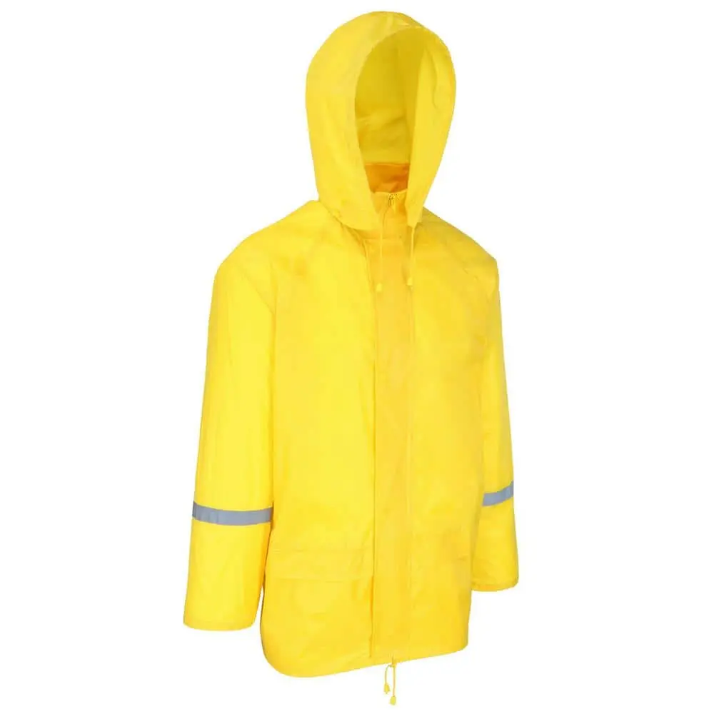 This 3-piece rain suit is made from durable 170T polyester with waterproof seams, designed for medium to heavy applications. It features a vented cape back for breathability and adjustable snap closures at the wrists and ankles to ensure a secure fit and allow a wide range of motion. The jacket has an easy zip-up front with a button storm flap for added protection, while the bibs have an elastic back for a better fit and to keep water out. Reflective tape enhances visibility in low light conditions, and the drawstring sweep on the jacket helps keep moisture at bay.