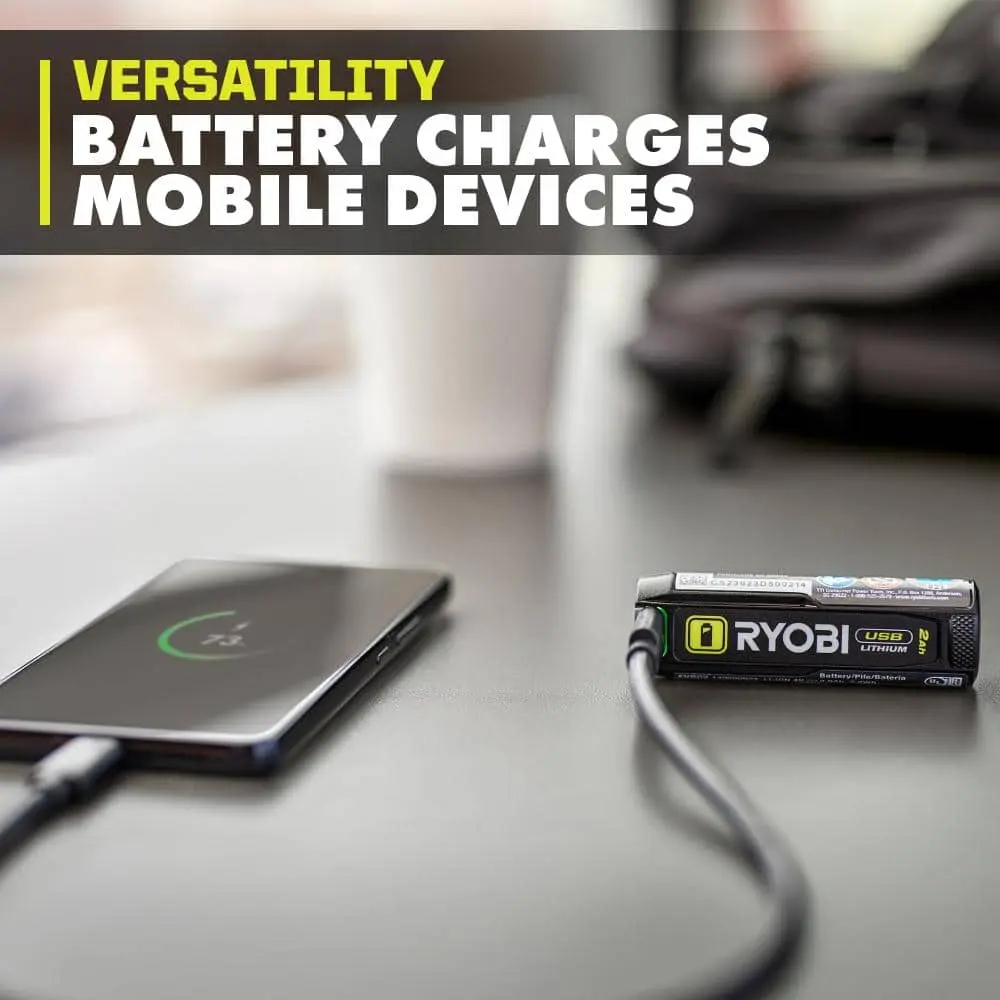 The RYOBI USB Lithium LED Compact Area Light Kit offers powerful illumination in a compact, durable design. This area light delivers up to 300 Lumens of light and provides hands-free operation with a folding metal hook, included carabiner, and compatibility with the RYOBI LINK Wall Storage system. With a long-lasting 52 hours of runtime on low with the included USB Lithium 2Ah Battery, this light is perfect for emergency situations. It features an IP54 dust and water resistance rating, ensuring reliable performance in tough conditions. The included battery has a USB-C port to charge mobile devices, and an LED fuel gauge to show the battery level with a simple press. Additionally, an LED indicator on the light shows green when charged and red when the battery is low. As part of the RYOBI USB Lithium System, this light offers a portable, rechargeable solution for all your lighting needs. The kit includes the FVL59 LED Compact Area Light, USB Lithium 2Ah Battery, USB Cable, and Operator's Manual.