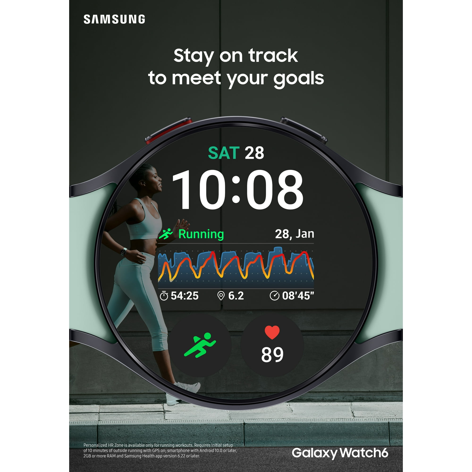 Maximize your day with the Samsung Galaxy Watch6, featuring our largest screen and advanced wellness tools. From the gym to the office, navigate easily and read clearly with the big display. Optimize workouts with personalized heart rate zones, improve rest with Advanced Sleep Coaching,* and stay connected with calls, texts, music, and notifications.* Customize your look with various bands* and watch faces.Key Features:Fitness Tracking: Get personalized performance insights.Personalized HR Zones: Train at different intensities to meet your goals.Advanced Sleep Coaching: Improve your sleep for a better start to the day.Multi-Device Sync: Seamlessly connect with your Galaxy devices for calls, texts, and music.BIA Analysis: Track body composition metrics like body fat and BMI.Bigger Screen: Enjoy our largest, durable display yet.Requires compatible Android device and Samsung Health app. The BIA feature is for general wellness tracking and is not for medical diagnosis.Available on the 44mm Galaxy Watch6 model only.