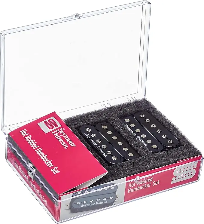 Seymour created this classic humbucker combination while in England in 1974, and it remains his favorite set of pickups to this day an SH-4 JB for the bridge and SH-2n Jazz Model for the neck. Together they provide one of the most versatile humbucker ever built. The JB Model humbucker is our most popular pickup of all time. It adds juice and versatility to the bridge position of any humbucker equipped guitar. With its hot coils, and alnico 5 bar magnet, this pickup delivers an unmistakable upper midrange attack, a tight, articulate low end, and harmonically rich highs that can really sing. The JB is the perfect bridge pickup for anything from blues & country to the meanest hard rock & metal. The Jazz Model neck humbucker uses an alnico 5 bar magnet and a special coil wind for an articulate, glassy treble response that balances very well with its full, but tight low end. The scooped midrange gives this pickup a smooth tonal character all its own. Originally designed as the matching neck pickup for the JB Model bridge pickup, the Jazz is an incredibly versatile humbucker that will work for almost any style of music. The Jazz Model is an excellent neck position counterpart for almost any of our moderate to high-output bridge humbuckers. The Jazz Model has been used by many great players over the decades, from Randy Rhoads to Jeff Beck to Seymour W Duncan. Hand built in our Santa Barbara, CA, factory, these humbuckers use an alnico 5 bar magnet, nickel silver bottom plate, 4-conductor lead wire for multiple wiring options, and are vacuum wax potted for squeal-free performance.