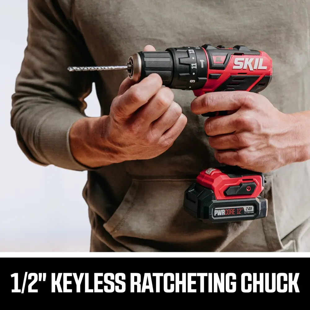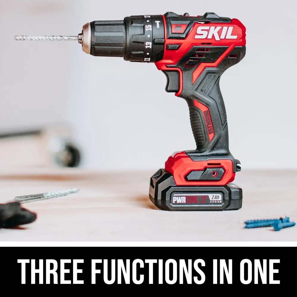 Tackle tough jobs with the SKIL Brushless 12V Hammer Drill Kit. This 1/2-inch drill is ideal for working with brick and mortar surfaces and features an LED light, 17 torque settings, and 2 speed settings. The brushless motor provides compact power, efficiency, and strong performance, while the lithium-ion battery extends runtime by 25 percent and doubles battery life. The hammer drill easily switches between hammer drilling, standard drilling, and screwdriver modes, allowing for quick bit changes to keep your work efficient. The kit includes a 2.0Ah lithium-ion battery with mobile charging, a fast charger that provides 25 percent battery in just 5 minutes, a belt clip, a PH2 bit, and a battery jacket.