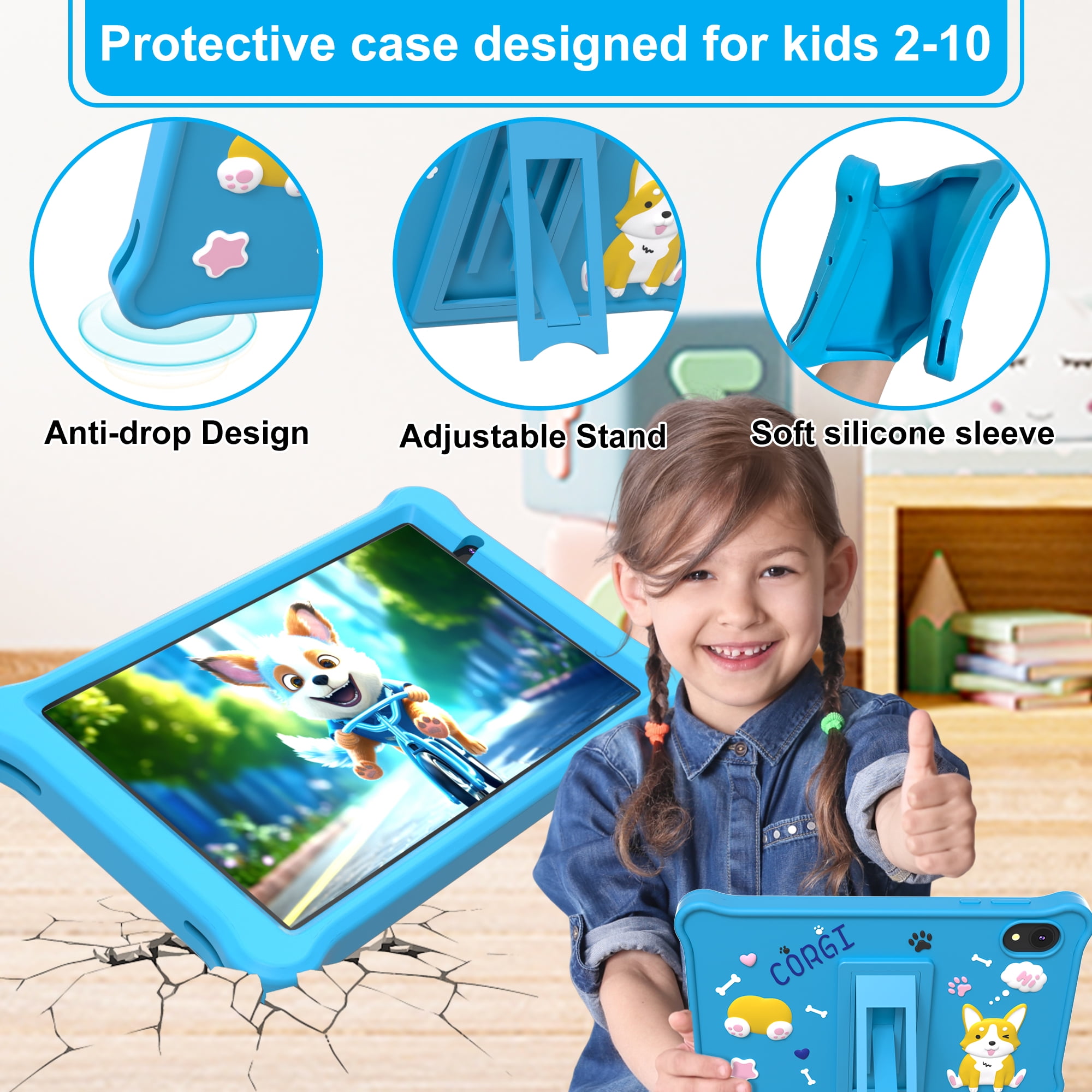 Durable Silicone Case: The included silicone case shields the tablet from dust, bumps, and falls, featuring a foldable stand suitable for home or school use. Its design prevents side and corner collisions, offering reliable protection for the tablet.
