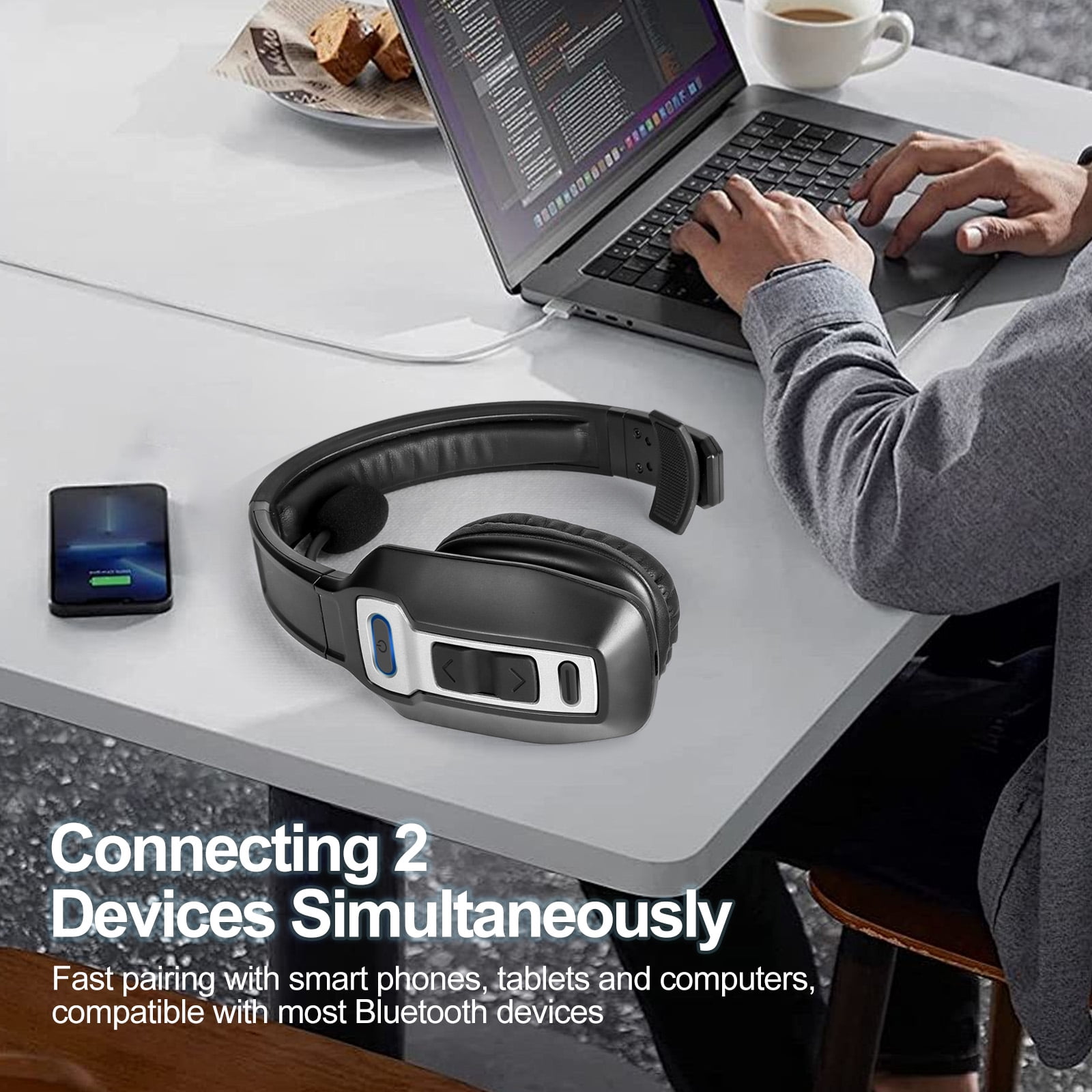 - Effortless Bluetooth Connection and Device Switching: Connect two devices simultaneously with ease. If you're on a video call and receive a phone call, you can switch to your calling device with just one click, ensuring you never miss important communications. The headset is compatible with most Bluetooth-enabled devices, including mobile phones, PCs, laptops, and computers, thanks to its Bluetooth 5.2 compatibility.