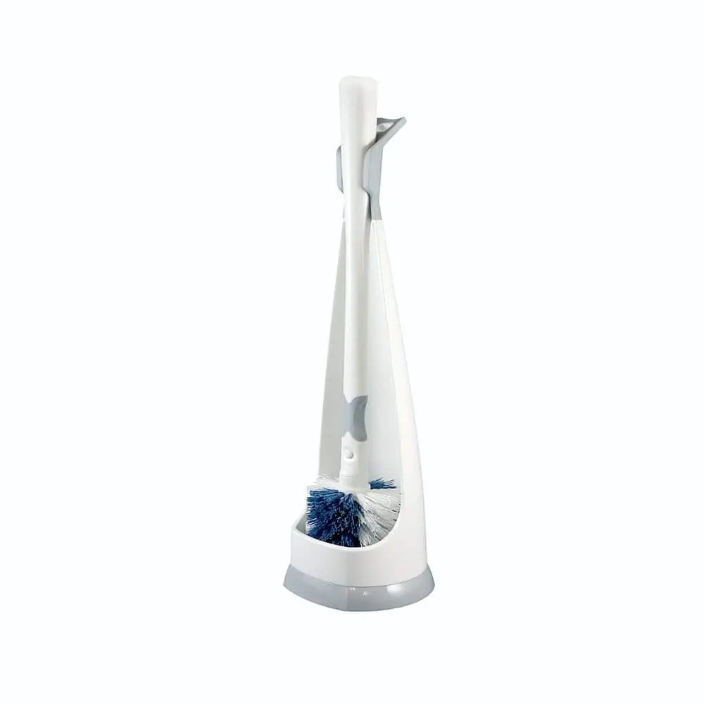 This toilet brush set features a portable caddy that eliminates dripping after use. The lightweight caddy catches excess water before the brush is placed back on the floor. The handle has a flexible neck that bends to reach under the rim and other tight spots or stays firm for scrubbing tough stains. When not in use, the caddy discreetly hides the brush from view.