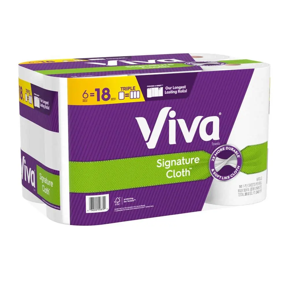 Viva Signature Cloth Paper Towels are the softest and most durable option, designed to tackle even your toughest cleaning tasks. This 6-roll pack contains 141 sheets per roll, offering plenty of towel power for various jobs. Twice as durable as regular towels, Viva paper towels are perfect for rinsing and reusing, whether you’re doing a weekly bathroom deep clean or scrubbing away stubborn messes on pots and pans. Their cloth-like texture makes them tough enough for any cleaning challenge, helping you achieve a thorough clean around your home. Tested against leading value brands, Viva towels outperform when wet.