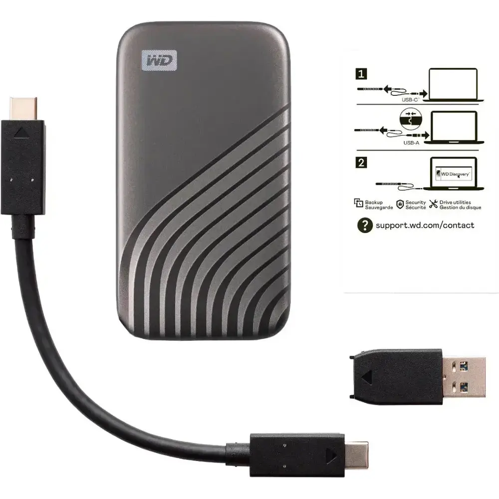 The WD My Passport 2TB External USB Type-C Portable SSD delivers blazing-fast NVMe performance with read speeds up to 1050MB/s, making file transfers quick and efficient. Its 2TB storage capacity provides ample space for your important files, photos, and videos. Designed with a durable metal casing in sleek Space Gray, this SSD is both stylish and sturdy, offering shock and vibration resistance and drop protection up to 6.5ft. The USB Type-C connectivity ensures easy compatibility and high-speed data transfer with a wide range of devices. For added security, it features password-enabled 256-bit AES hardware encryption, keeping your data safe wherever you go