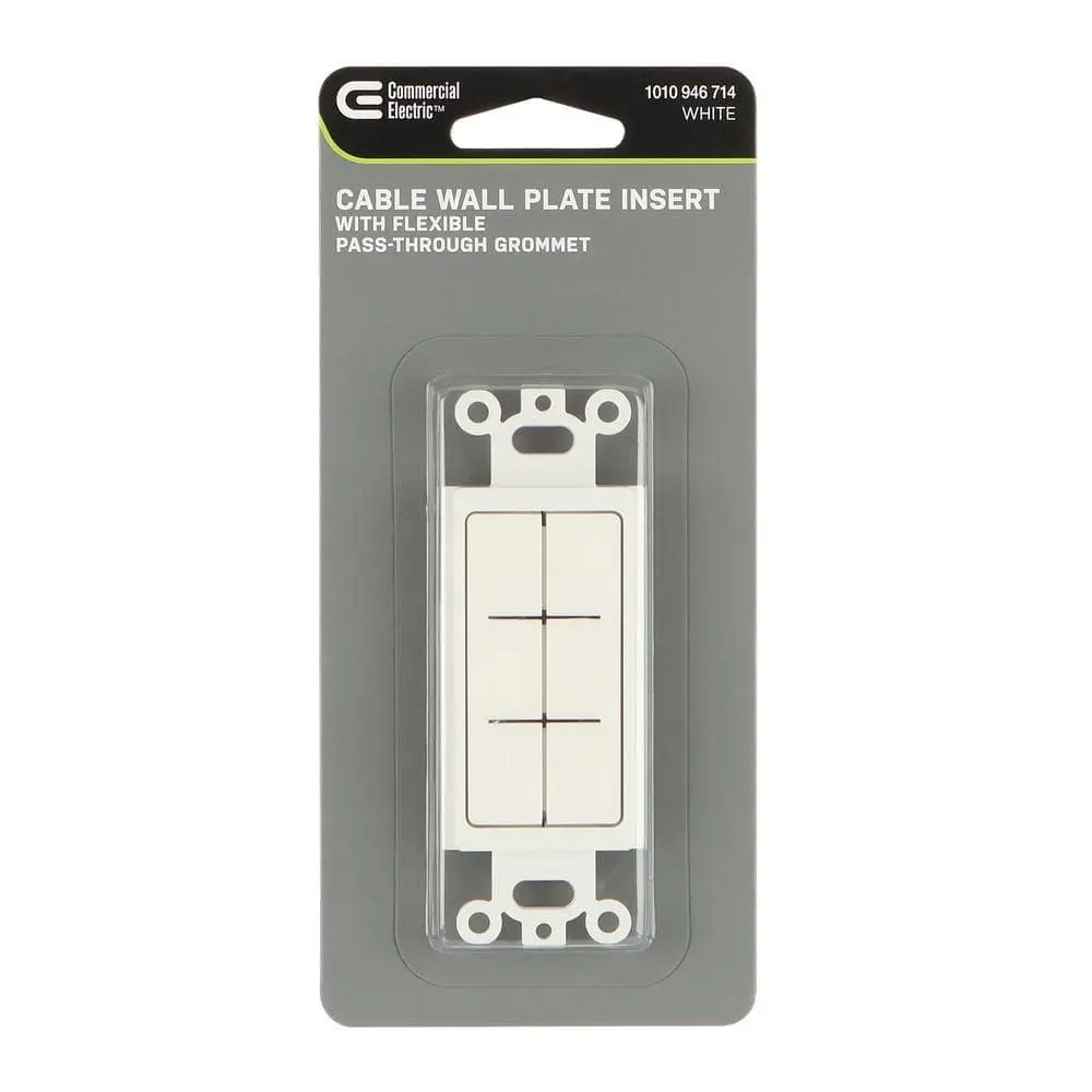 The Commercial Electric 1-gang flexible opening cable wall plate insert is designed for use with any 1-gang rocker opening. It offers an efficient and discreet solution for managing low-voltage cables within the wall, ensuring a clean, organized setup for multimedia connections. Installation requires a low-voltage mounting bracket and a compatible wall plate with at least one rocker opening (both sold separately). Featuring a patented, energy-efficient flexible pass-through grommet, it helps minimize air loss while delivering excellent cable management. This insert keeps cables neatly hidden, enhancing the appearance of any multimedia setup.
