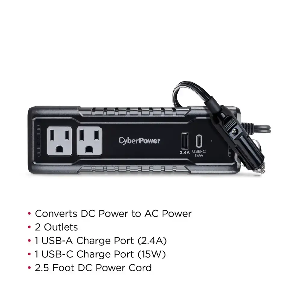 Stay powered up on the go with the CyberPower M175XUC 175W Power Inverter, featuring dual USB-A and USB-C ports for versatile charging options and a single AC outlet to power laptops and small appliances. Its compact and lightweight design makes it easy to carry, while built-in overload, overheat, and short-circuit protection ensures safe operation. Simply plug it into your vehicle’s 12V DC car adapter for convenient power wherever you travel