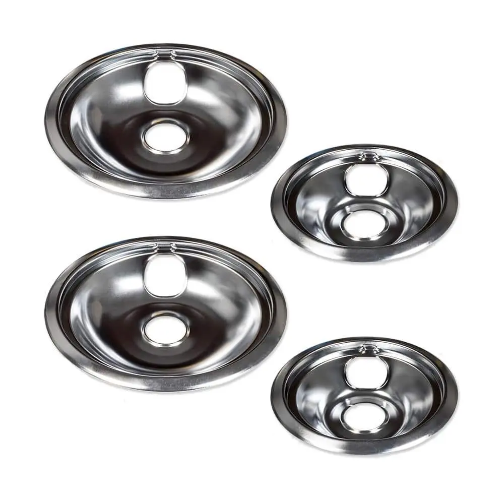 The Everbilt 4-pack chrome drip bowls are designed to catch cooking drips, helping to maintain a clean stove. They are compatible with most GE and Hotpoint plug-in electric ranges. Regularly replacing your stove's drip bowls not only gives it a refreshed look but also promotes more even cooking by improving heat distribution. The chrome finish enhances heat reflectivity, contributing to better meal preparation. With a combined ring and pan design, these one-piece drip bowls are easy to clean and replace. This set includes two 8-inch bowls and two 6-inch bowls.