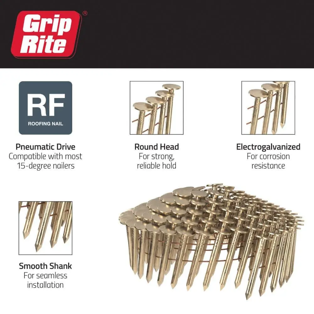 Grip-Rite GRCR3DGAL 1-1/4 in. x 0.120-Gauge 15° Smooth Shank Electrogalvanized Wire Collated Coil Roofing Nails are designed for use with most 15° pneumatic nailers to securely fasten shingles to roofs. These nails are electrogalvanized for enhanced corrosion resistance and come in a pack of 7,200 smooth shank, wire-collated steel nails. All Grip-Rite collated nails are supported by the Grip-Rite Jam Free Guarantee.