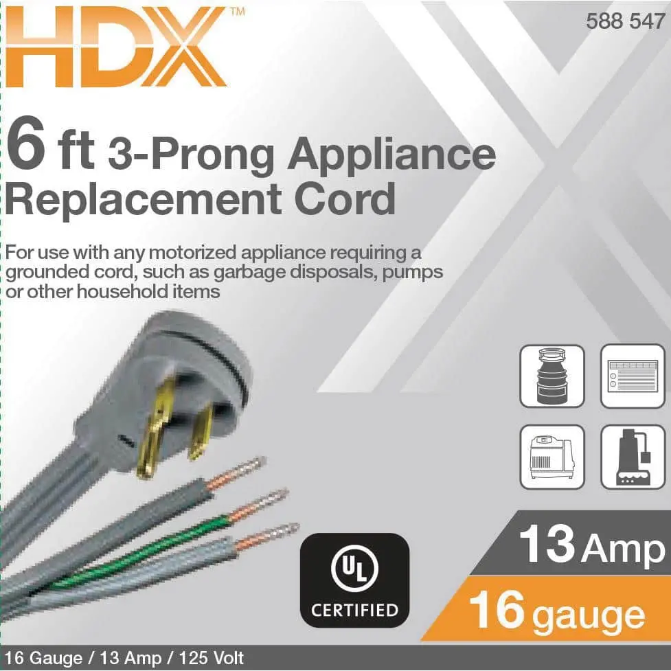 The HDX 6 ft. Gray 16/3 SPT-3 Appliance Cord is designed for replacing the wiring of indoor appliances like garbage disposals or pumps. The cord features tinned and stripped ends, making installation easier. With an electrical rating of 13 Amp, 125-Volt, and a 1,625-Watt capacity, this cord is reliable for various household appliances.