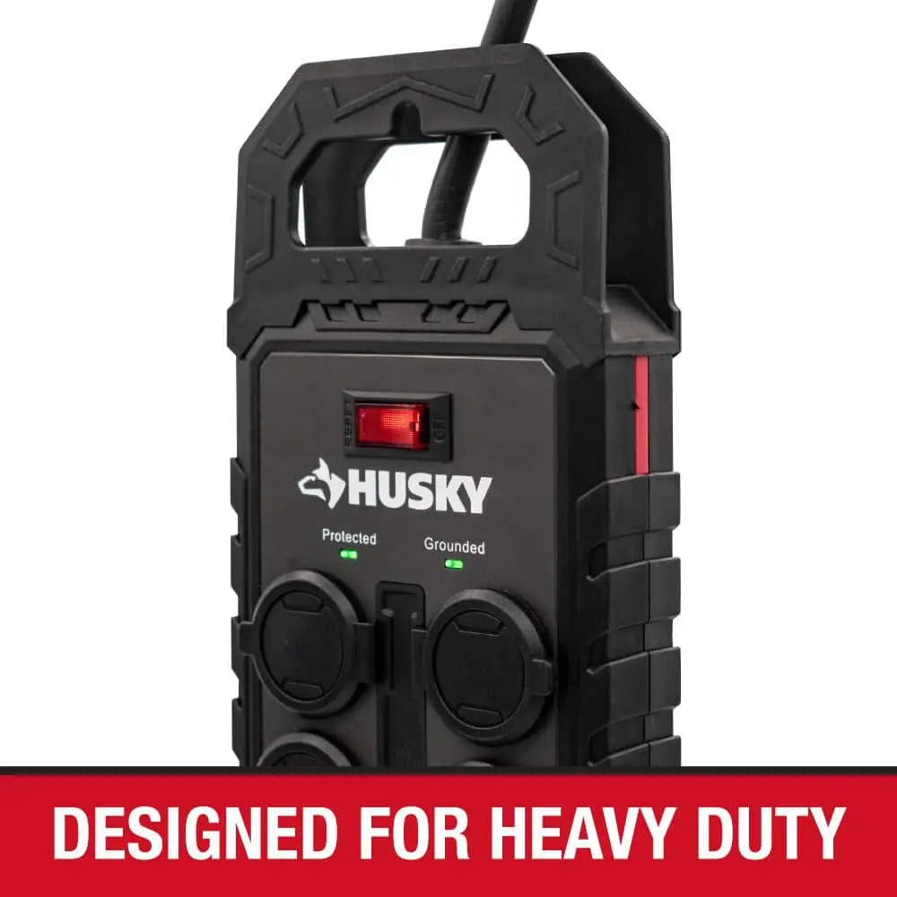 The Husky 10 ft. 14/3 Heavy-Duty 10-Outlet Surge Protector with USB-A and USB-C connections is perfect for powering tools and electronic devices in your garage or workshop. Built with durable rubber covers and a thick bumper, it’s designed for heavy-duty use. The 10 ft. cord with a right-angle plug provides extended reach and helps prevent outlet overcrowding.