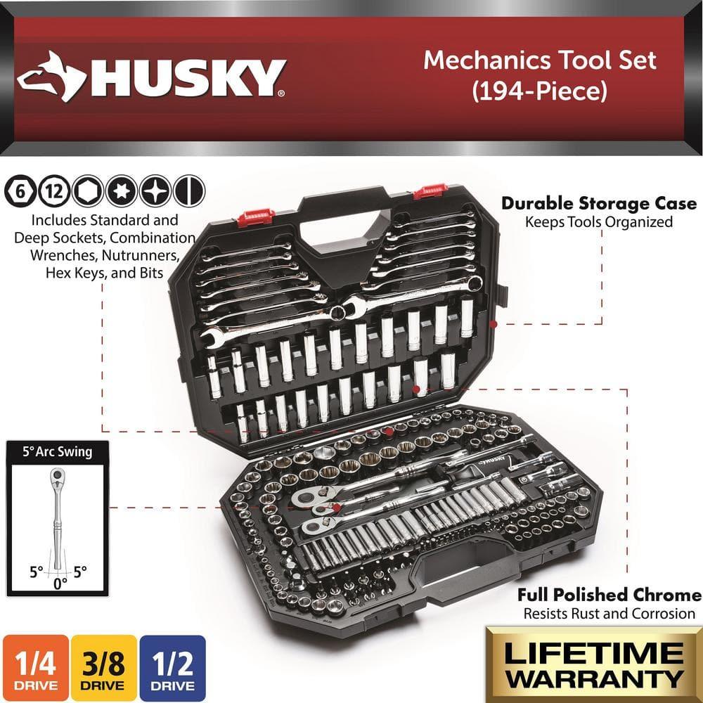 Introducing the ultimate Mechanics Tool Set from Husky a comprehensive arsenal of sockets, wrenches, and bit sockets designed to conquer any fastening task, no matter the size. Engraved with precision and built for durability, these tools are housed in a convenient plastic storage case with dedicated compartments for each of the 194 pieces. Crafted from tough Chrome Alloy steel and finished to resist corrosion, this set is ready for the toughest challenges. With 125 standard and deep sockets, as well as 14 combination wrenches, there's no project this set can't handle. Whether you're a professional or a DIY enthusiast, this portable powerhouse is the perfect companion for getting the job done right.