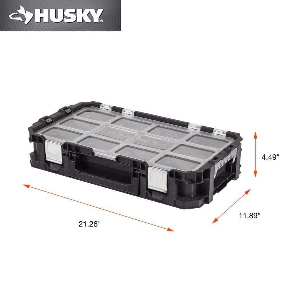 ntroducing the Husky Connect Organizer: Your Go-To Solution for Small Parts Storage. Whether you're a professional tradesman or a passionate DIYer, the Husky Connect Organizer is the perfect tool for keeping your small parts and accessories organized and accessible. Its compact design and lightweight construction make it easy to carry around your workspace, while the removable bins allow you to customize your storage solution to fit your specific needs. Never lose track of your essentials again. The clear lid lets you see the contents of the organizer at a glance, so you can quickly find what you need. And with heavy-duty resin construction and metal latches, you can rest assured that your items will stay secure, even when you're on the go. Key features: Removable bins for customizable storage Clear lid for easy visibility Lightweight construction for easy portability Comfortable handle for comfortable carrying Compatible with Husky Connect toolbox for additional storage Experience the convenience of the Husky Connect Organizer. Order yours today and start organizing your workspace more efficiently.