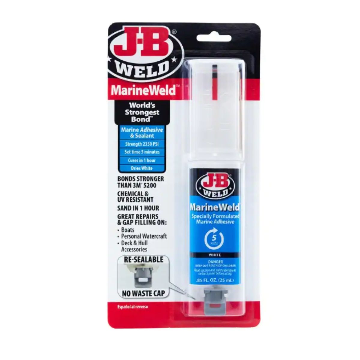 MarineWeld by J-B Weld is a uniquely designed two-part adhesive solution that offers durable and long-lasting repairs for joining various surfaces, whether they are different or similar, including metal, SMC fiberglass, and more. When left at room temperature, MarineWeld solidifies within 5 minutes and will have a white appearance once fully cured. Afterward, it can be easily tapped, filed, sanded, and drilled while maintaining its full strength whether above or below the waterline.