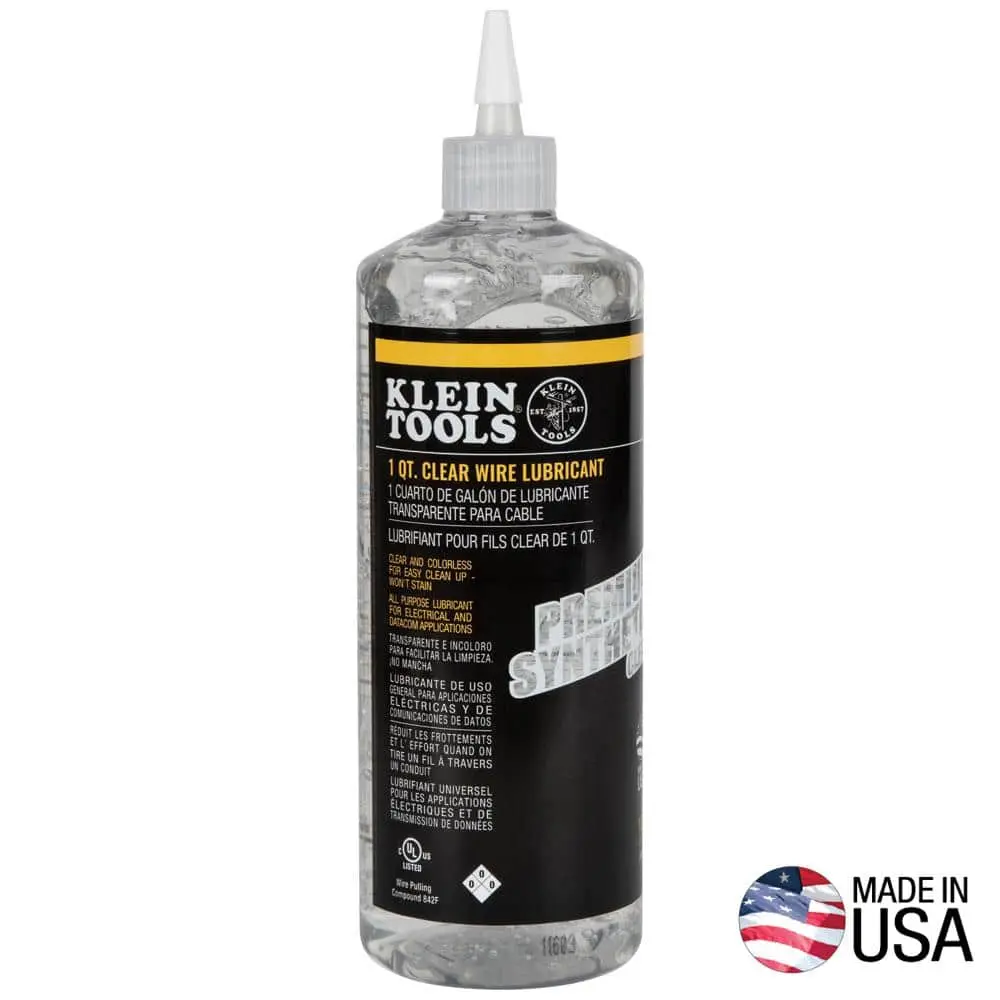 The Klein Tools 32-ounce Premium Synthetic Clear Lubricant ensures a smooth, frictionless pull for cables through conduit. This slow-drying, non-toxic lubricant is clear, making it perfect for use in finished spaces like rooms with painted walls or carpeted floors, as it won't leave stains.