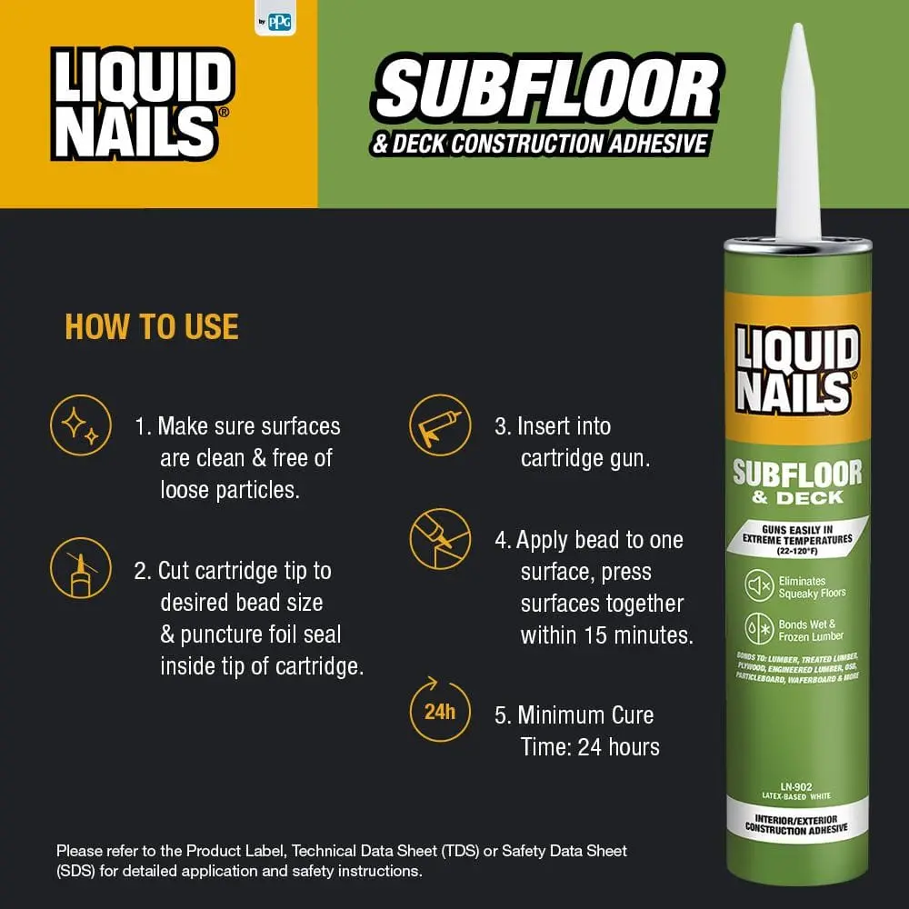 Ensure a strong, durable bond for subfloors and decks with Liquid Nails Subfloor and Deck Construction Adhesive. Its low VOC formula makes it safer for both indoor and outdoor use while providing a moisture-resistant seal for long-lasting performance. Designed to reduce floor squeaks, it securely bonds wood-to-wood and wood-to-metal connections. The 10 oz. cartridge allows for precise application, and its extreme temperature resistance ensures reliable use in various weather conditions