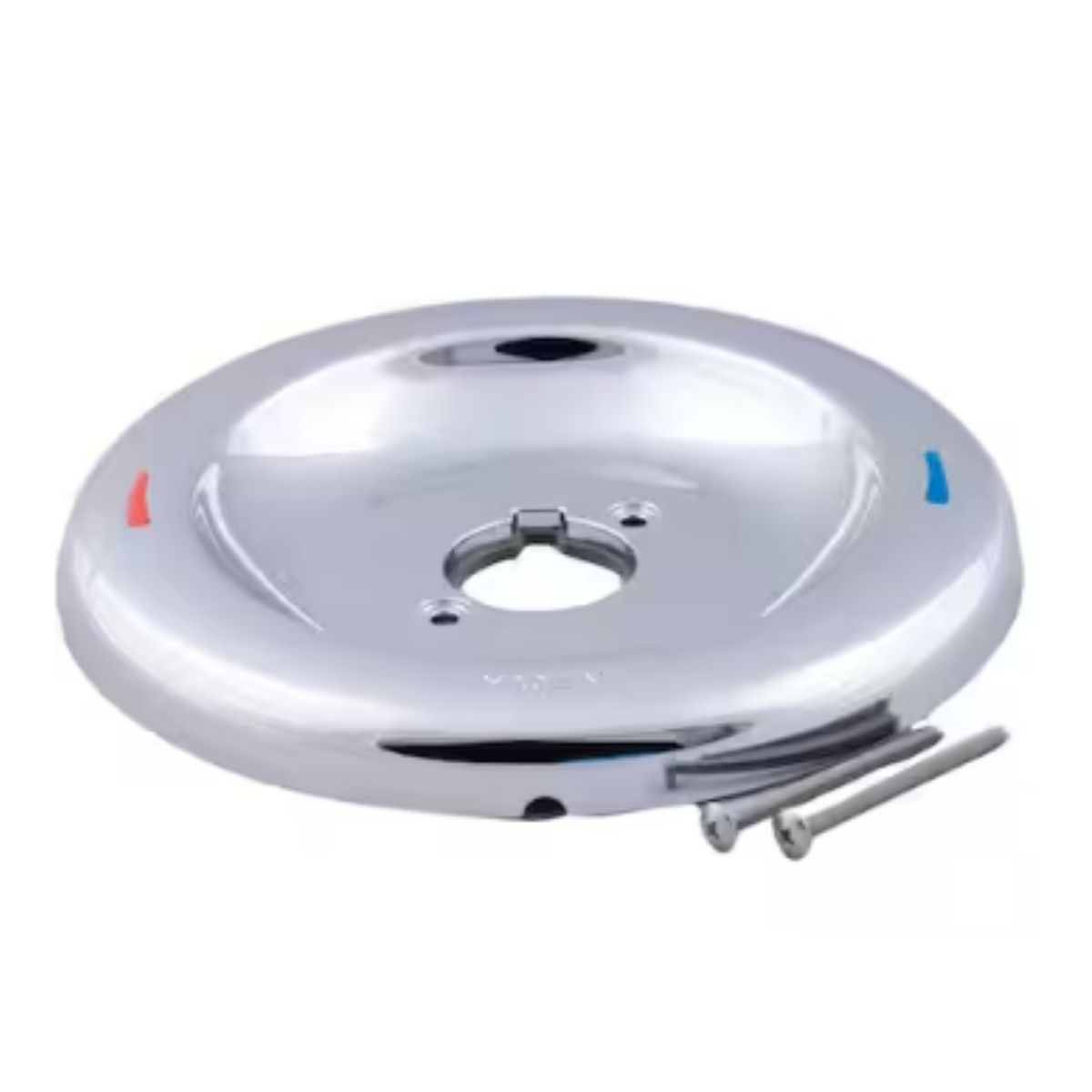 This plate is made to fit the MOEN Posi-Temp rough-in valve kit. It has a shiny chrome finish, giving it a cool grey metallic appearance. The plate includes red and blue temperature indicators.