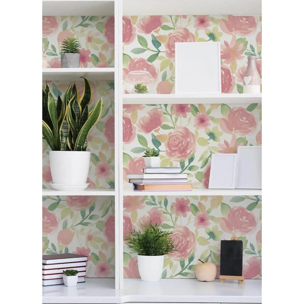 Add a touch of whimsical, feminine charm to your walls with this stunning peel and stick design. Soft watercolor pink florals, accented with vibrant green leaves, beautifully frame the blooms against a clean white backdrop.