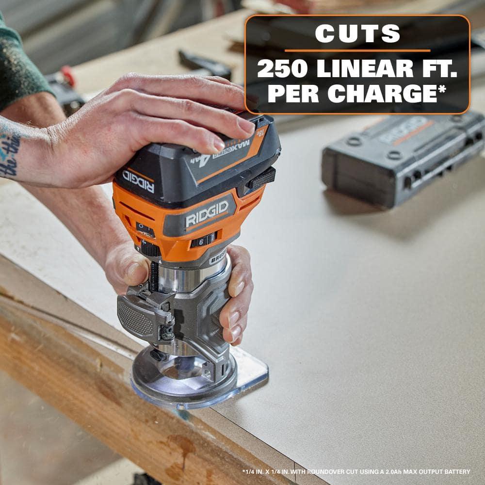 Elevate Your Routing Tasks with the RIDGID R860444 Brushless Compact Router (Tool Only). Powered by advanced brushless motor technology, this router delivers exceptional performance and longer runtime, offering 50% more power than its predecessor and surpassing even corded units in strength. Crafted with a premium die-cast body and rubber overmold, the R860444 ensures enhanced durability and up to 40% vibration reduction, providing a smoother and more controlled experience. With a roundover bit, it cuts up to 250 ft. per charge when used with a 2.0 Ah MAX Output Battery, maximizing your efficiency and productivity with fewer battery changes. The router features a micro-adjustment dial for quick and precise depth adjustments, while the variable speed dial allows you to fine-tune the torque to suit your desired cut. Keep your workspace clean with the vacuum dust port that minimizes mess and reduces cleanup time. The improved on/off rocker switch and single-action base removal ensure ease of use, while the spindle lock makes accessory changes and macro-adjustments quicker and simpler. Fully compatible with all RIDGID 18V batteries, this tool is supported by the industrys best Lifetime Service Agreement. Register within 90 days of purchase for free parts, free service, for life. The R860444 Brushless Compact Router includes the router, a collet wrench, dust chute, edge guide, and a fixed D-shaped base. Batteries and charger are sold separately. For unbeatable performance and reliability, the RIDGID R860444 is your go-to router.