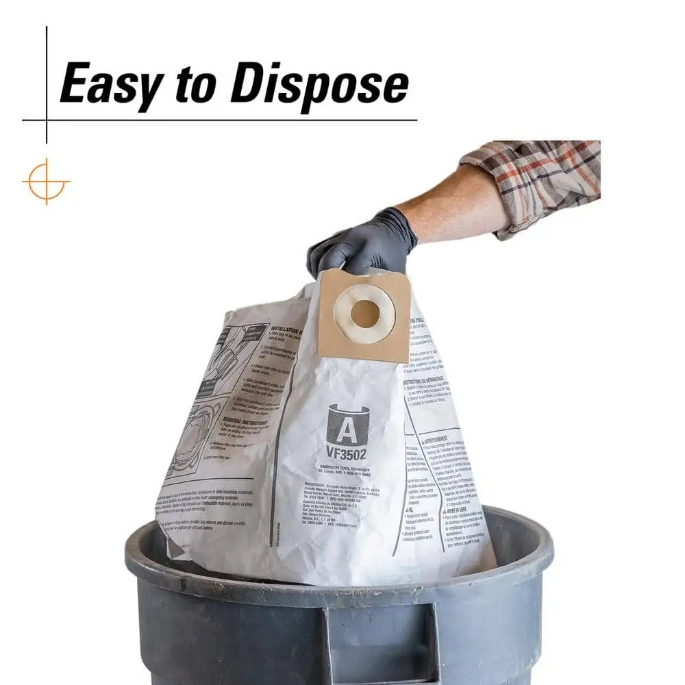These high-efficiency bags reduce filter clogs, improving vacuum performance and extending filter life. For optimal results, pair with a RIDGID vacuum filter (sold separately). Available in 6, 12, 24, and 36-count packs to meet various project needs. Installation and removal are easy: align the collar with the inlet, press it against the drum, and pop the collar out for disposal.