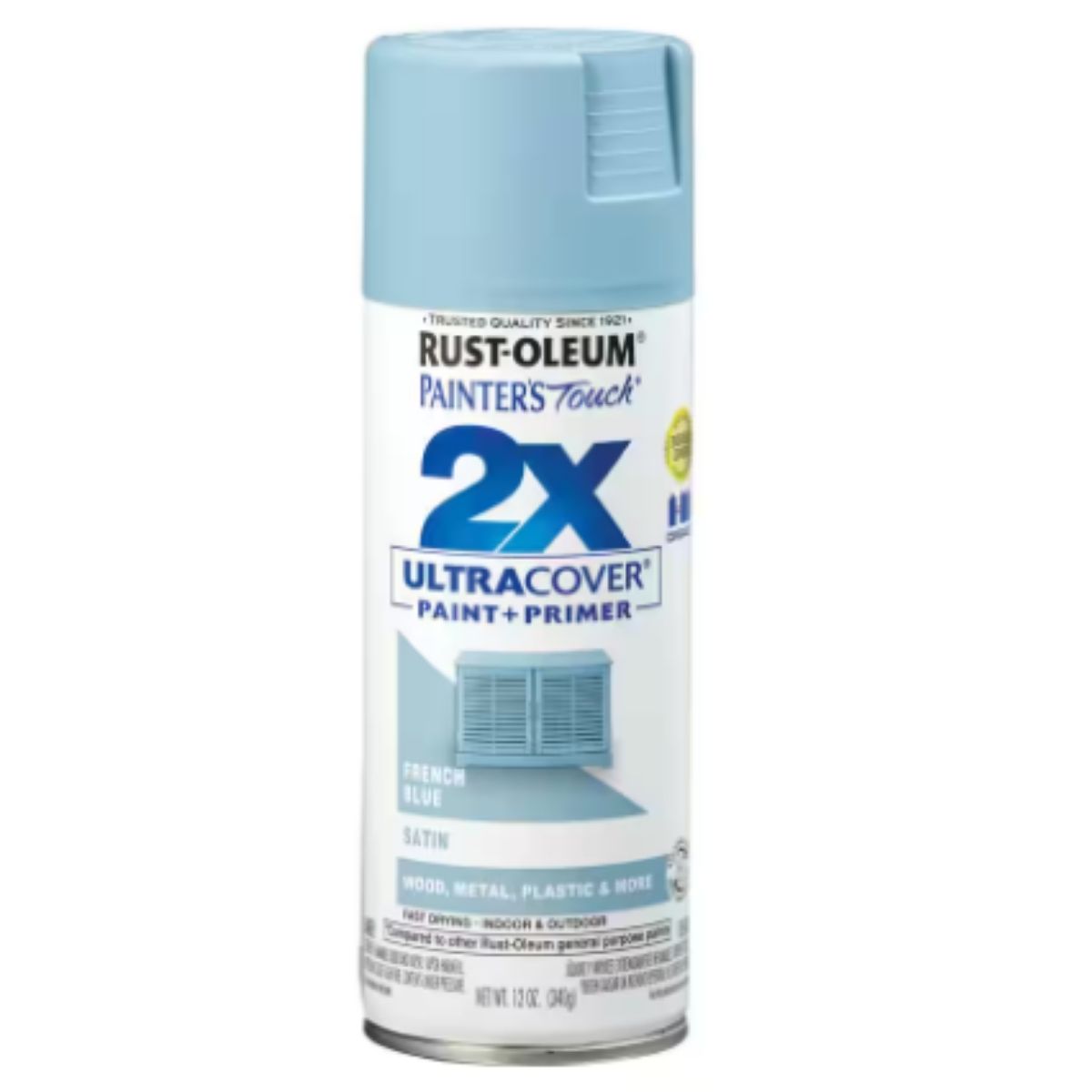 Rust-Oleum Painter's Touch Ultra Cover 2X 12 oz. Satin French Blue General Purpose Spray Paint features innovative double cover technology, providing twice the coverage compared to other Rust-Oleum general purpose paints, allowing for quicker project completion. Its paint and primer formula ensures excellent hiding power and durability, suitable for both interior and exterior use on various surfaces such as wood, metal, and plastic. The satin finish not only adds a fresh shine to surfaces but also delivers long-lasting protection against the elements. Equipped with an any-angle spray system, it allows spraying in any direction, including upside down, to cover hard-to-reach areas effectively. The oil-based formula dries to the touch in just 20 minutes, facilitating rapid application and enabling faster turnaround times for projects. Cleanup is straightforward with mineral spirits. Combining paint and primer in one product, it offers convenience and efficiency while achieving professional-quality results.