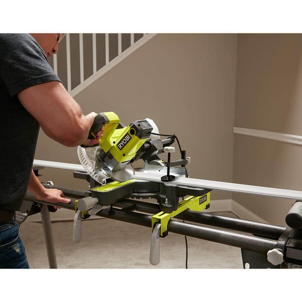 The RYOBI 7-1/4 in. Sliding Miter Saw is a compact and lightweight tool ideal for DIY projects. It features a powerful 10 Amp motor that reaches up to 5,350 RPM, enabling precise and tough cuts in wood. The saw's 1-1/4 in. dust port helps maintain a clean work area, while the 40-tooth Carbide-Tipped blade ensures fast, clean cuts and can handle cross cuts up to 2 in. x 10 in. Backed by a 3-Year Manufacturer's Warranty, it comes with essential accessories including a blade wrench, dust bag, work clamp, carrying handles, and an operator's manual.