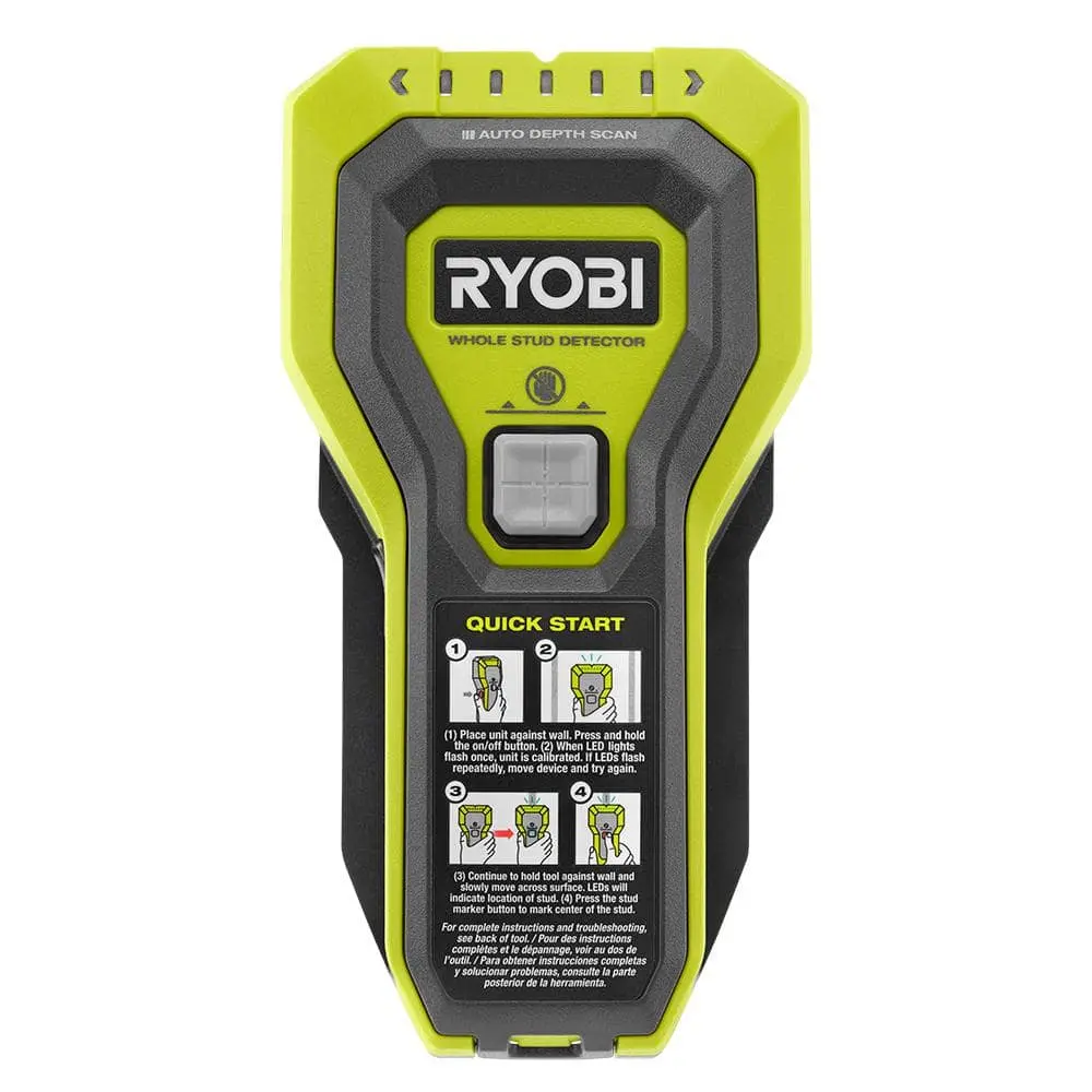 The RYOBI Whole Stud Detector features multiple LEDs that display the full width of the stud, ensuring precise detection beyond just the edge or center. Its one-handed operation offers a consistently easy user experience. The Auto Depth Scan Technology accurately identifies wood and metal studs, measuring wall thickness up to 1-1/2 in. For added convenience, the built-in stud marker allows quick marking of the stud center without a pencil. Includes (1) Whole Stud Detector, (2) AAA Batteries, and an Operator's Manual