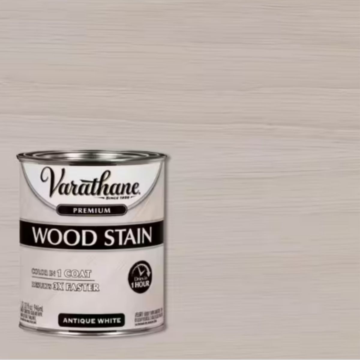 Varathane 1 qt. Antique White Premium Fast Dry Interior Wood Stain delivers high-quality color in just one coat, enhancing the natural beauty of interior wood surfaces effectively. This fast-drying formula, drying in only 1 hour, utilizes nano pigments for superior color clarity and coverage. It's designed for efficiency, covering up to 275 sq. ft. per quart and achieving rich, deep colors without needing multiple applications. The semi-transparent stain seals wood pores and accentuates wood grain, making it suitable for various surfaces like furniture, cabinets, doors, trim, floors, and paneling. Available in a range of trendy and vintage colors, it offers versatile finishing options. Cleanup is easy with mineral spirits, and for enhanced durability and protection, it can be top-coated with Varathane polyurethane. Notably, this product doesn't require a wood conditioner before application, simplifying your staining projects while providing lasting results.