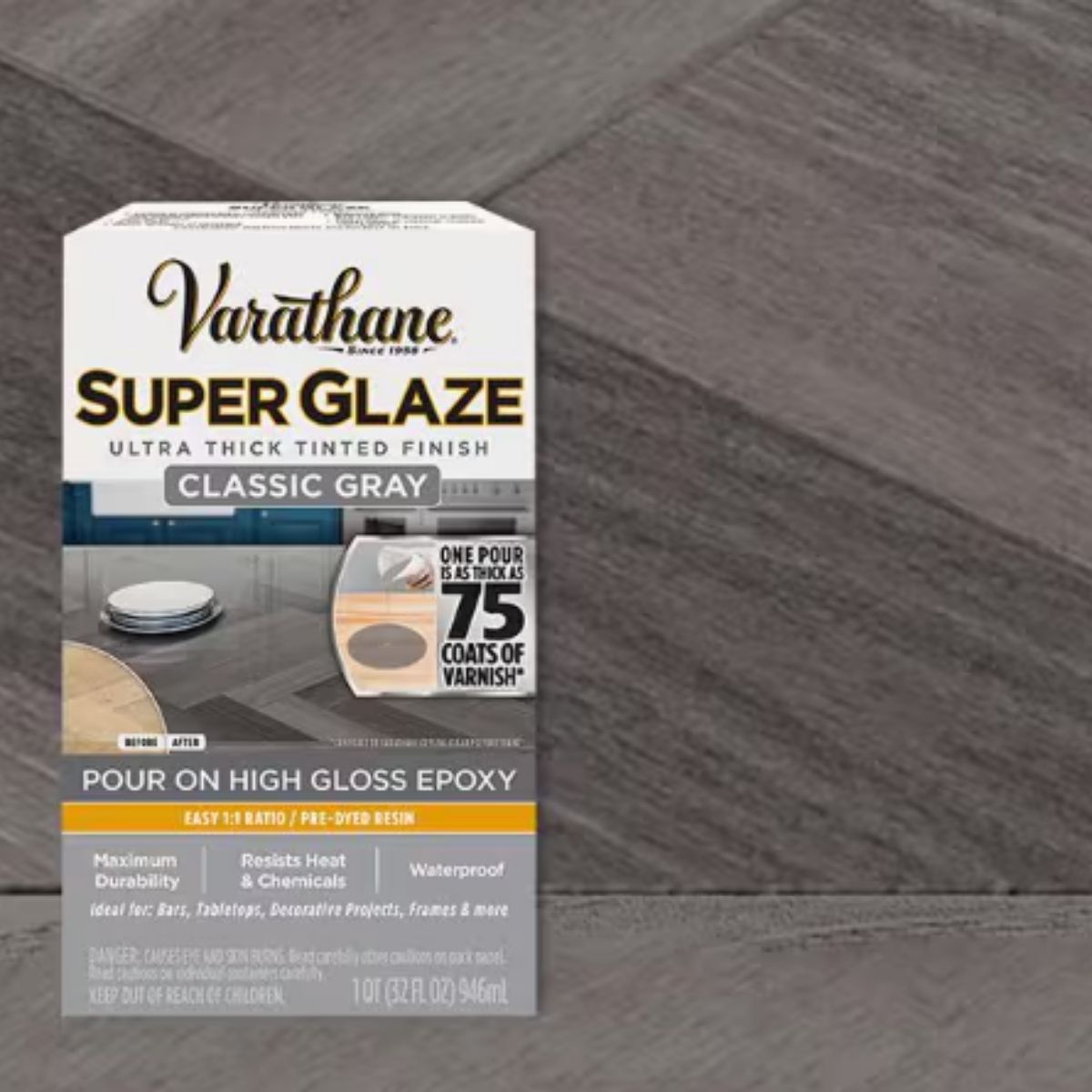 Varathane Super Glaze Ultra Thick Tinted Finish is a highly versatile epoxy coating designed for interior surfaces, offering a simple pour-on application to waterproof and enhance various items like tabletops, bars, furniture, and more. Its pre-dyed resin ensures consistent color without settling, providing an ultra-glossy, translucent finish that mimics the thickness of 75 coats of varnish in just one application. Ideal for DIY projects such as river tables and kitchen islands, this durable formula resists heat, chemicals, and water, ensuring long-lasting protection and beauty. With an easy 1:1 mix ratio of resin and activator, it dries to the touch in 8 hours and cleans up effortlessly with mineral spirits, making it a practical choice for achieving professional-quality results at home.