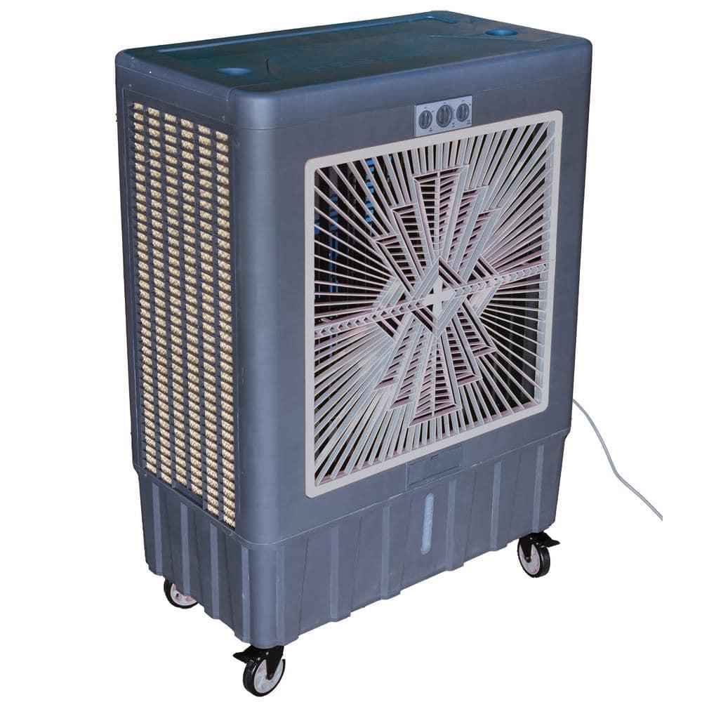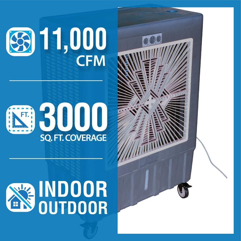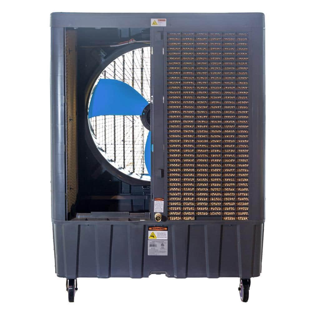 The Hessaire 11,000 CFM Evaporative Cooler combines a compact design with high performance, surpassing larger models. Its efficiency comes from expanded air-intake areas and high-density XeL50 media, featuring three panels instead of the typical single panel. This design improves air intake and reduces static pressure, resulting in more effective air delivery. The XeL50 media offers 80% more evaporation surface than standard media, enhancing cooling performance. Note: This unit is not an air conditioner, so it uses less energy and reduces electricity costs. It is ideal for dry climates or open areas and works best with open windows or doors for proper ventilation.