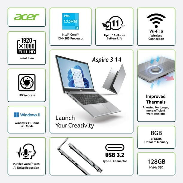 The Acer Aspire 3 is designed for practical multitasking and productivity, making it a great choice for everyday tasks. Powered by an Intel Core i3 processor, this lightweight and slim laptop helps you stay productive whether you're working, browsing, or enjoying entertainment on the go.