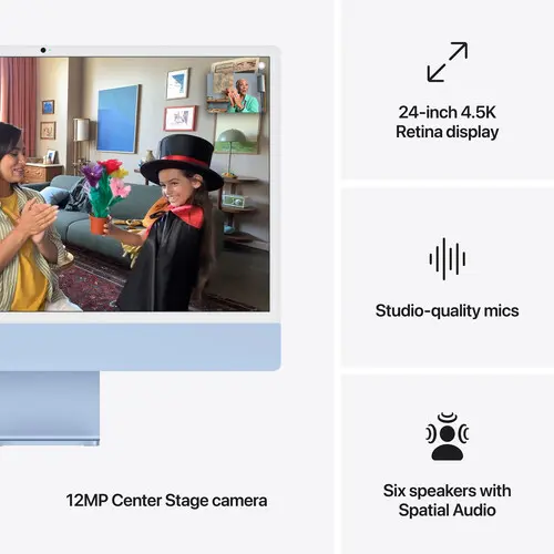 With 24GB of unified memory and a spacious 1TB SSD, the iMac runs macOS and Apple apps with remarkable speed and fluidity.
