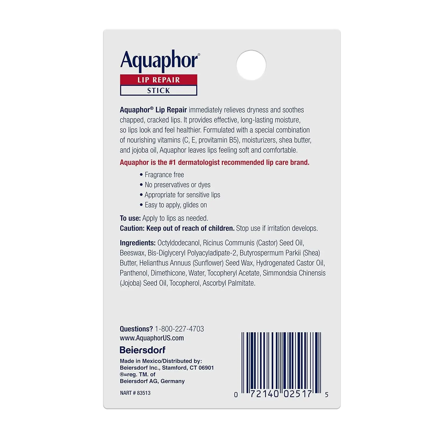Dermatologist Recommended: Aquaphor is the top recommended brand for lip care.Relieves and Soothes: Clinically proven to relieve dryness and soothe chapped lips.Nourishing Formula: Contains vitamins, moisturizers, Shea Butter, and Jojoba Oil.Free Of: Fragrance-free and paraben-free, providing long-lasting moisture.Pack Includes: Two 0.17-ounce sticks of Aquaphor Lip Repair Balm.