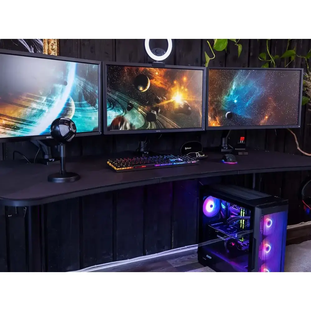 The Arozzi Arena Ultrawide Curved Gaming Desk offers a spacious 160 cm wide surface, perfect for setting up an expansive gaming or work station. Its curved design enhances your experience by providing ergonomic comfort and an immersive feel. Built with a solid frame, it ensures sturdy construction for long-lasting durability. The desk also features an integrated cable management system, keeping your setup clean and organized. Finished in a sleek pure black color, it adds a modern, professional look to any space