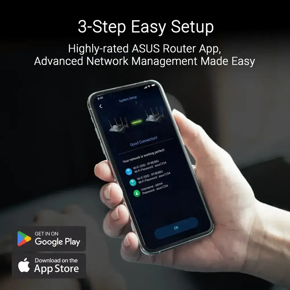 The ASUS BE7200 Dual-band WiFi 7 Router offers cutting-edge technology for superior network performance. With WiFi 7 Technology, it supports the latest standard for ultra-fast speeds and minimal latency, perfect for seamless streaming and gaming. The router’s Dual-Band Connectivity provides both 2.4GHz and 5GHz bands, optimizing performance and minimizing interference. It delivers impressive speeds of up to 7200 Mbps, ensuring high-speed internet for multiple devices. Advanced Security with AiProtection Pro safeguards your network and privacy, while MU-MIMO Support ensures multiple devices can connect simultaneously without slowing down. The router is easy to set up using the ASUS Router App, and it offers High Coverage for large homes or offices, ensuring reliable connectivity throughout