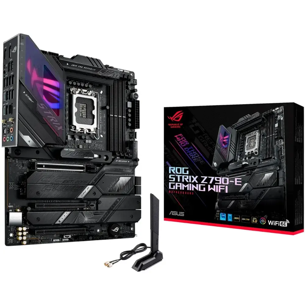 The ASUS ROG STRIX Z790-E GAMING WIFI motherboard is designed to elevate your gaming and performance experience with its LGA 1700 socket that supports both 12th and 13th Gen Intel Core processors. Powered by the Intel Z790 chipset, this motherboard offers DDR5 memory support, allowing for up to 128GB of high-speed RAM. It features Wi-Fi 6E for blazing-fast wireless connectivity and Intel 2.5Gb Ethernet for reliable wired networking. The board comes with PCIe 5.0 x16 slots, providing ample bandwidth for next-gen GPUs, and offers expansive storage options with 5x M.2 slots and 4x SATA 6Gb/s ports. Enhanced cooling is ensured through robust VRM heatsinks and multiple fan headers. A premium SupremeFX 7.1 Surround Sound provides an immersive audio experience, while the sleek black PCB with RGB lighting and Aura Sync support gives your build a stunning visual appeal. The motherboard is built in an ATX form factor, offering flexibility for powerful system configurations.