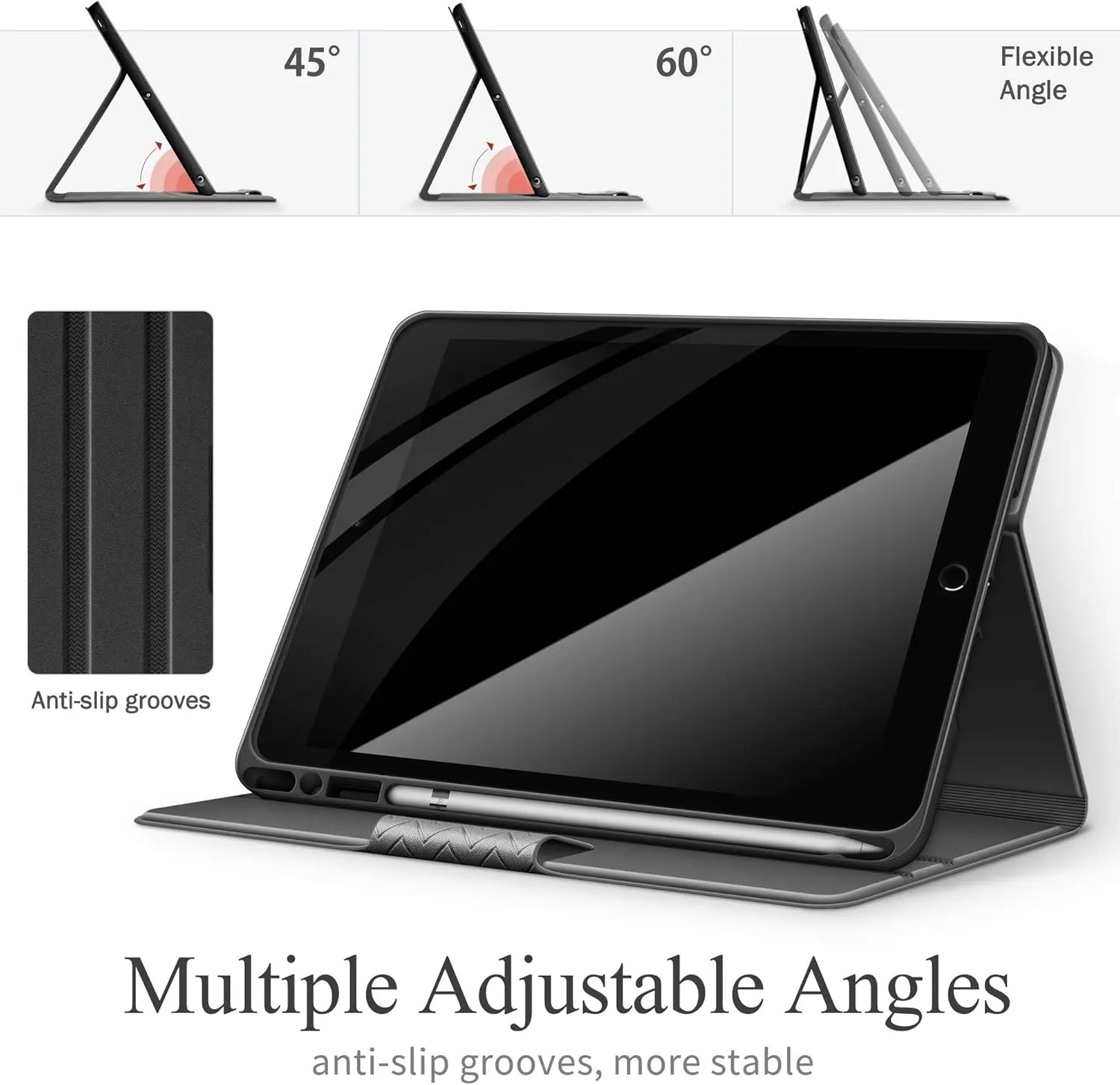 The auaua Case for iPad 9th/8th/7th Generation is a durable, soft-shell case designed to protect your device. It features a built-in pencil holder and supports automatic sleep/wake functionality. The anti-slip grooves provide adjustable viewing angles for hands-free use, while the magnetic closure conserves battery life. Made with high-quality materials, the case offers shock absorption and a soft interior lining for added protection. Its professional and stylish design, with a leather-like appearance, is easy to clean and available in multiple colors.