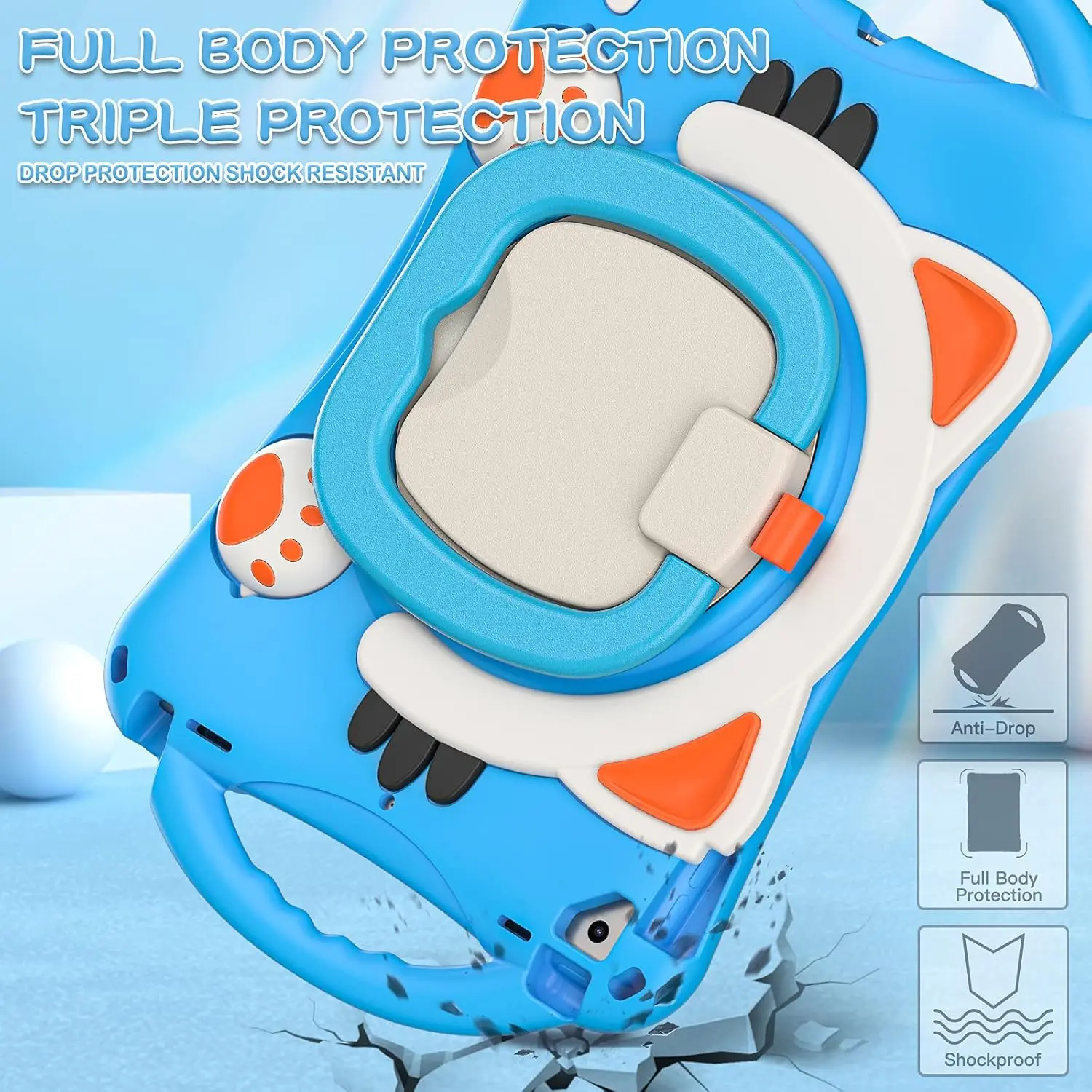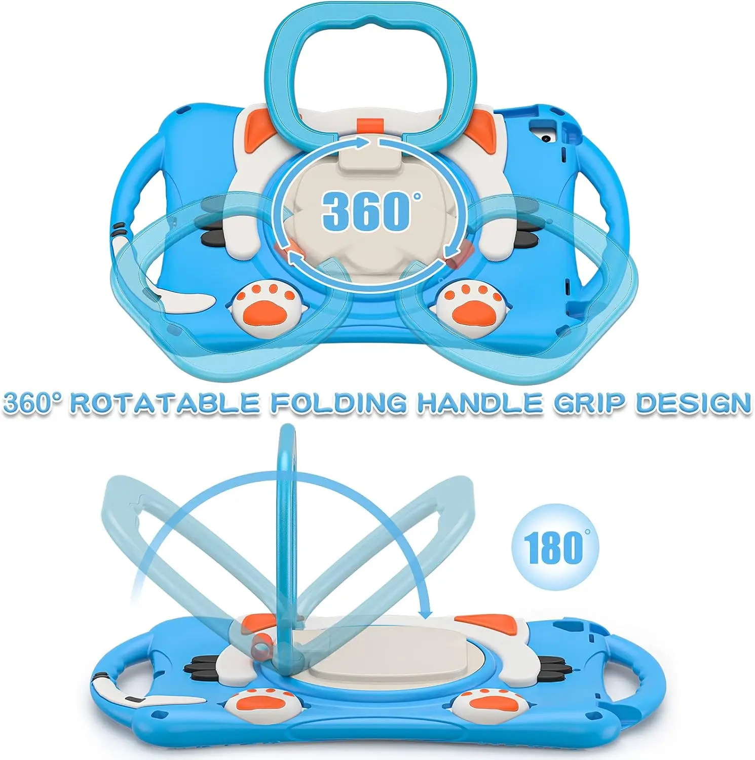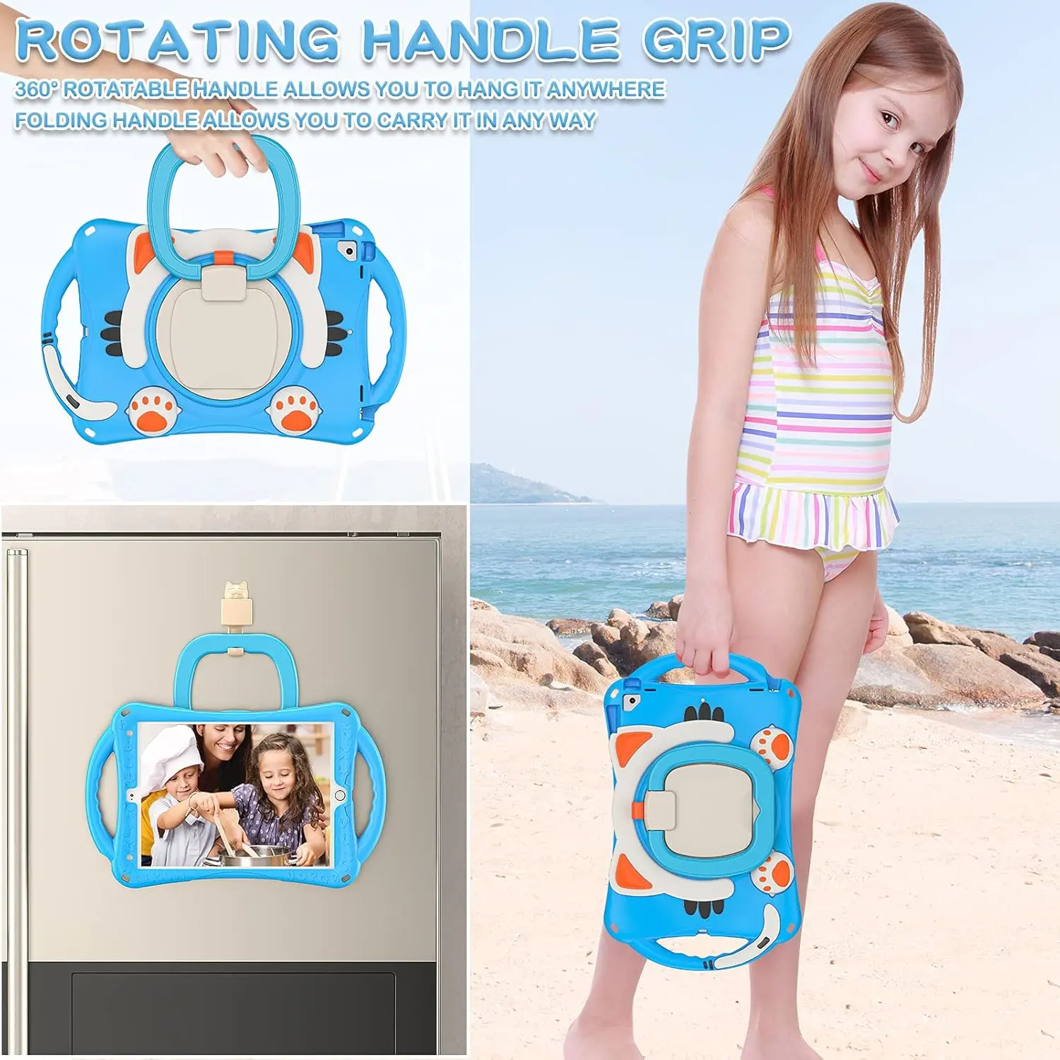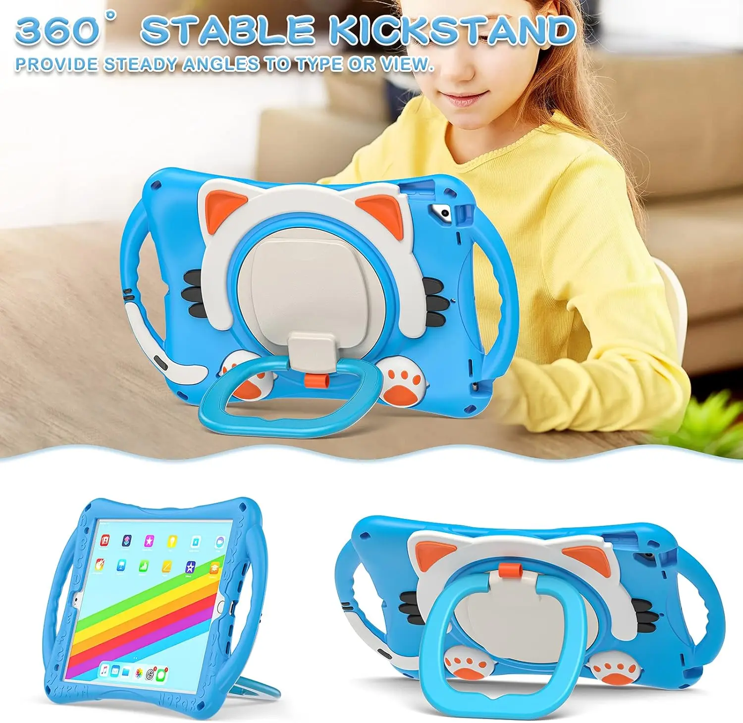 The BATYUE Case for iPad 9th/8th/7th Generation (10.2 inch) is a kid-friendly, full-body protective case featuring a patented cartoon cat design in black and red. Compatible with iPad models from 2021, 2020, and 2019, it offers 360-degree rotating stand functionality for versatile viewing angles and handles for easy carrying. The case includes a removable shoulder strap for portability and hands-free use, such as hanging on a car seat. Its durable silicone material protects against drops, shocks, and scratches, making it ideal for children and active users.