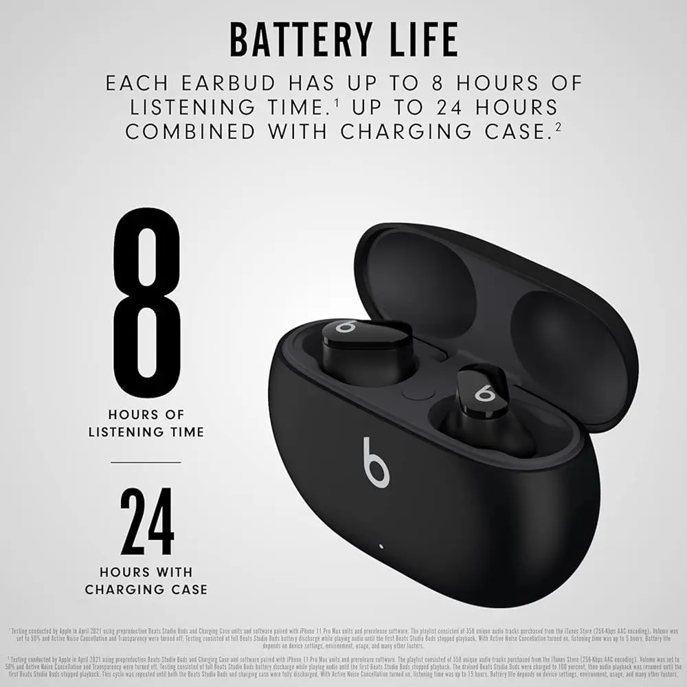 • In the box: Beats Studio Buds, charging case, three sizes of ear tips, USB-C to USB-C charging cable, Quick Start Guide,(USB-C power adapter sold separately)