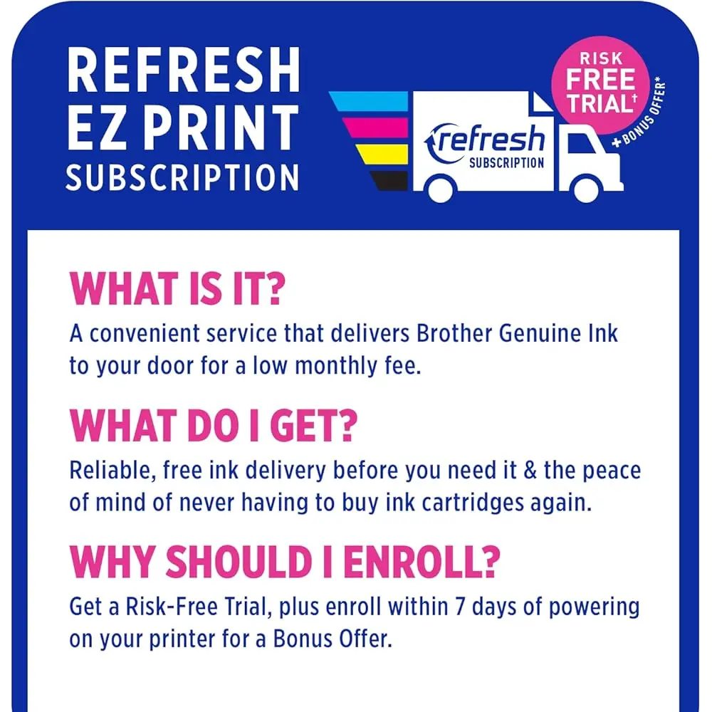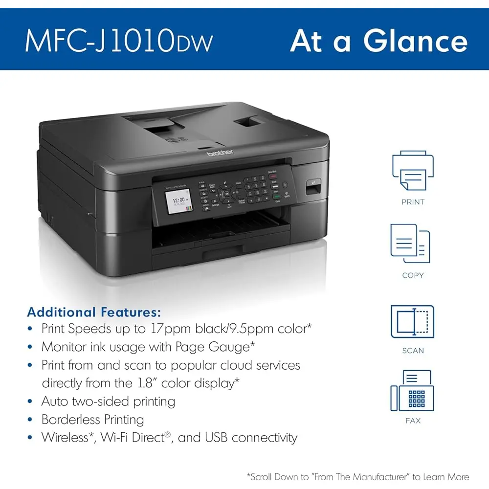 The Brother MFC-J1010DW color inkjet all-in-one printer is perfect for home, home office, or small office use, offering robust features and business functionality typically found in higher-priced models. It prints up to 17 ppm (black) and 9.5 ppm (color) and is compact, economical, and ideal for small spaces. The printer provides multiple connection options, including built-in wireless, Wi-Fi Direct, and USB. It offers reliable printing, copying, scanning, and faxing, with wireless printing capabilities from desktops, laptops, smartphones, or tablets. The 1.8-inch color display makes navigation simple, and the Brother Mobile Connect app lets you manage the printer remotely. The Page Gauge™ feature estimates remaining ink levels, and the printer includes a 20-page ADF and a 150-sheet adjustable paper tray. With duplex printing and mobile and Cloud connectivity, you can print from and scan to popular services directly from the device. works with Alexa.