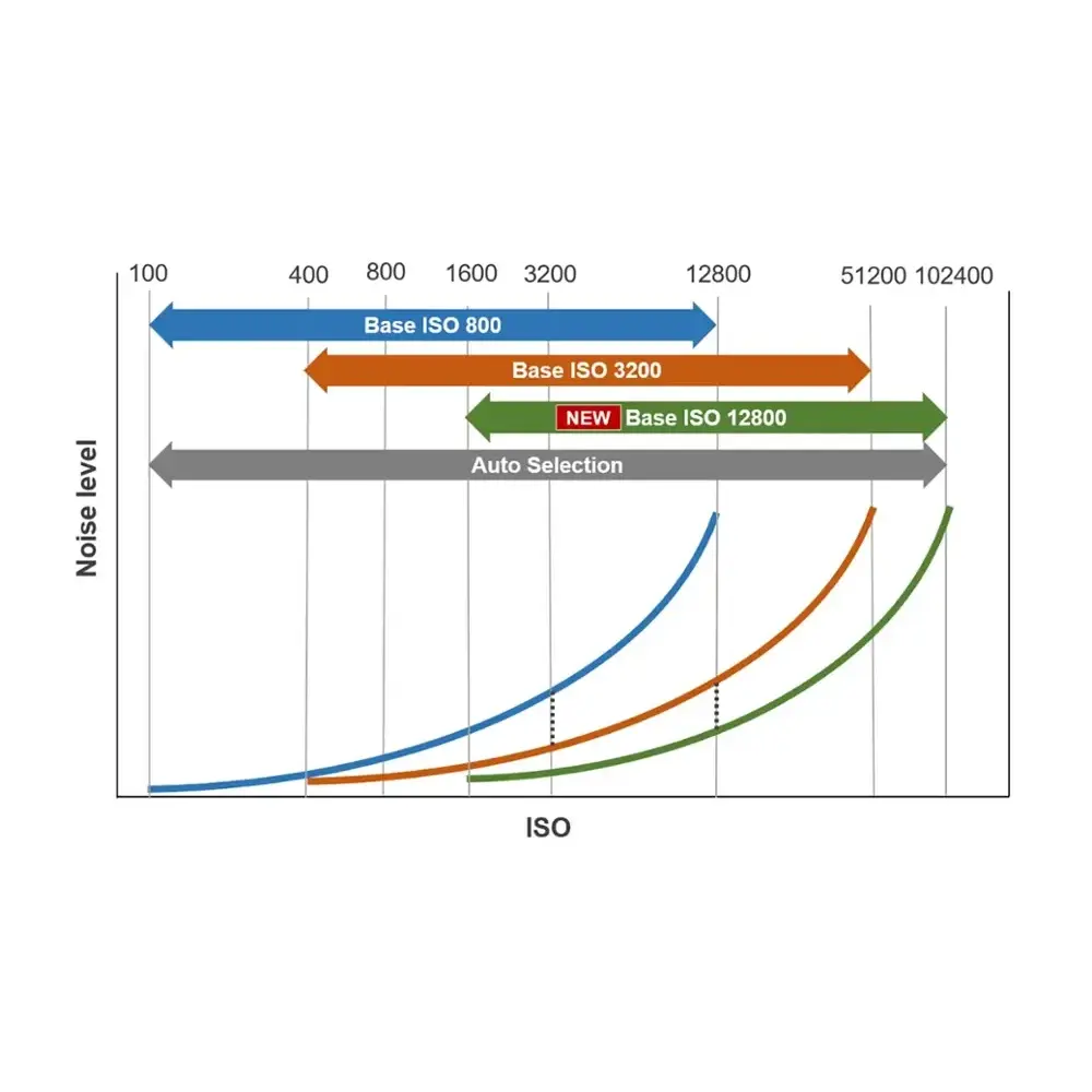 - Triple Base ISO (800, 3200, 12,800): Provides superior performance across various lighting environments, allowing the camera to perform in both bright and low-light settings with full dynamic range.